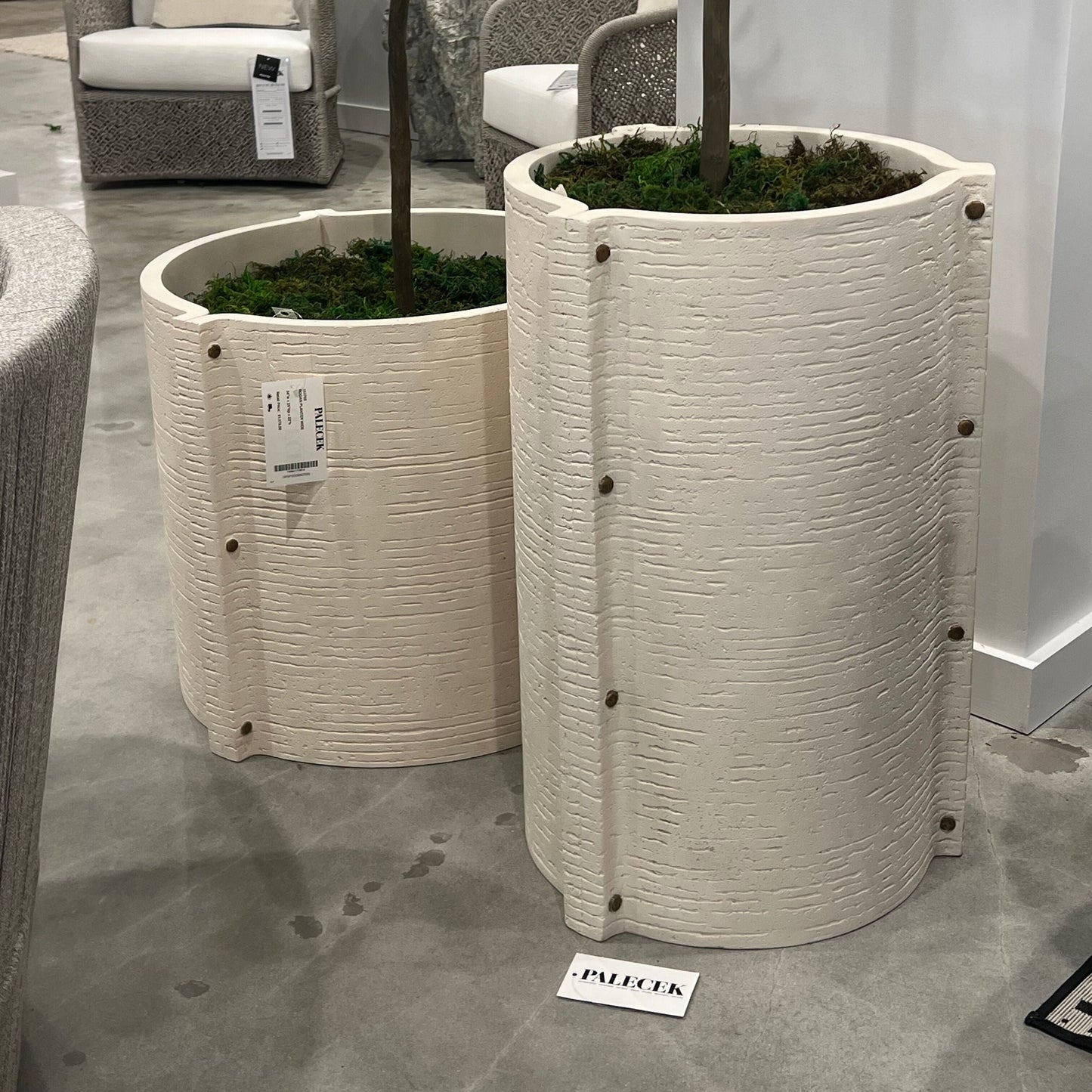 The Tall Rogan Planter from Palecek features a white textured stonecast that is accented with hand-painted bronze details. The Tall Rogan Planter is the perfect addition for styling any indoor living space and is also suitable to be displayed outdoors.