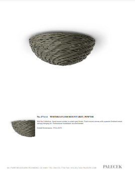 Palecek presents the Wisteria Flush Mount in Gray Wicker and Pewter. Designed by Kirk Nix, the Wisteria features a hand-woven wicker frame with a pewter-finished metal canopy kit.