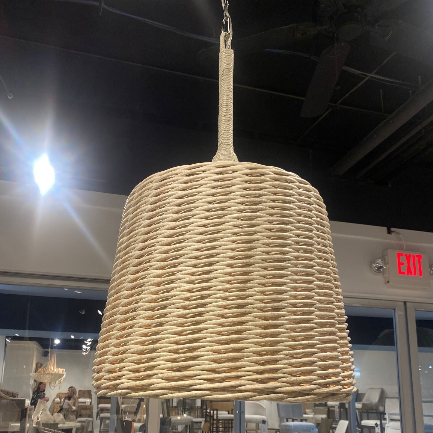 Part of the Kirk Nix Collection, this versatile light features hand-woven synthetic wicker accented with a synthetic hand-twisted rope hanger all in a whitewash finish. Comes with shiny steel finished metal chain and canopy hanging kit. Suitable for covered outdoor use in a damp location with no direct water contact.