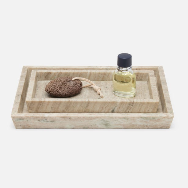 The Athlone Tray Set in Beige Marble by Pigeon and Poodle highlights the natural striations and stripes of marble through strategically placed panels. The marble's thickness and sharp corners give this beigey, neutral collection a certain crispness.