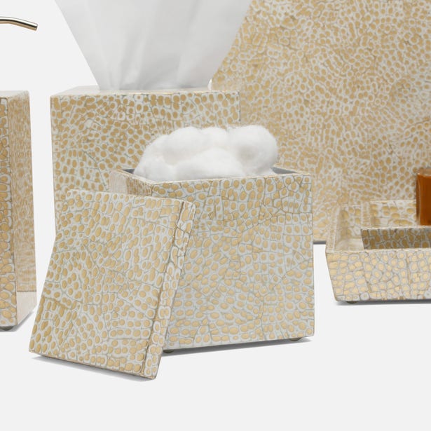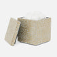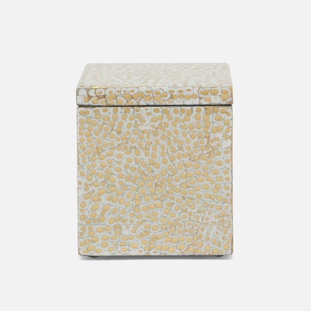 The Callas Canister in Gold White Lacquered Eggshell by Pigeon and Poodle showcases a refined mosaic crafted from lacquered, cracked eggshell, embodying sophisticated elegance.
