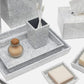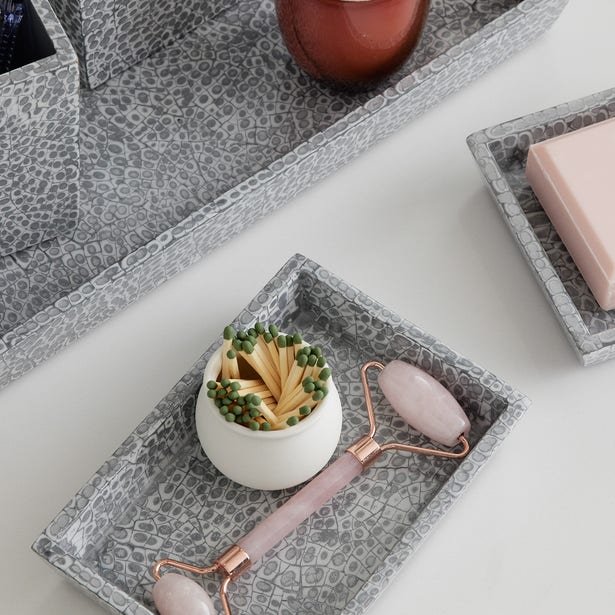 The Callas Tray Set in Silver Lacquered Eggshell by Pigeon and Poodle features a sophisticated mosaic crafted from lacquered, fragmented eggshells.