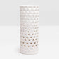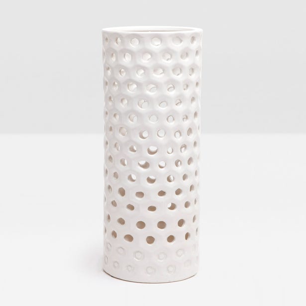The Edmonton Umbrella Stand in Glossy White from Pigeon and Poodle is a multifunctional ceramic piece featuring a honeycomb design.