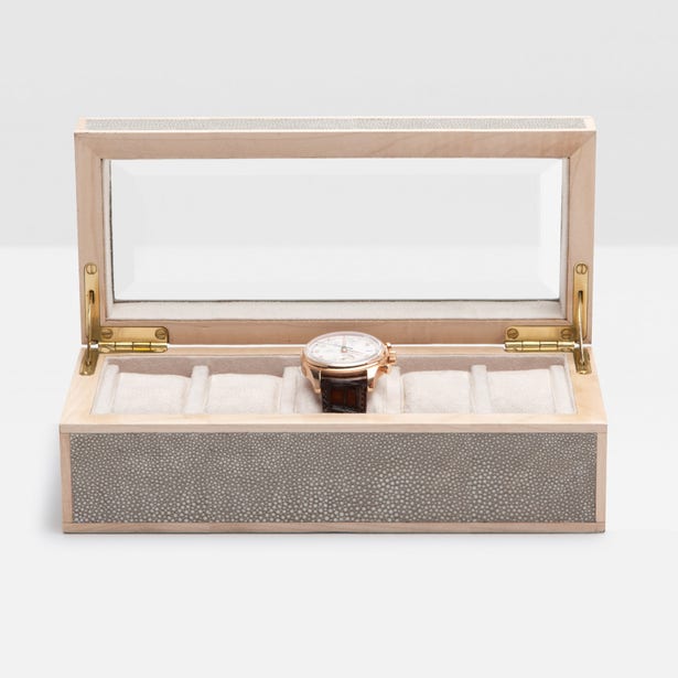 The Elmbridge Watch Box in Sand Faux Shagreen from Pigeon and Poodle stores your watches in style. The faux shagreen and glass top add luxury to any dresser or vanity, while the divided compartments keep your watches safe and beautifully displayed