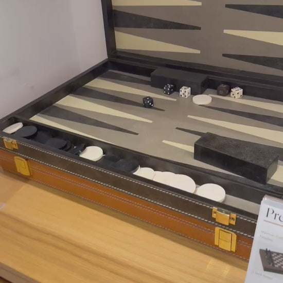 Luxury date night is now a thing. Impress your guest with the Grantham Backgammon Game in Gray Hair-on-Hide from Pigeon and Poodle. The Grantham hair-on-hide pattern looks chic on your desk or coffee table. Open the box to find it finished in leather, with horn and bone game pieces. Pop open a bottle of your favorite champagne and see whether skill or luck is really how to win the game. *This item is handcrafted and may show slight variation from one piece to another.