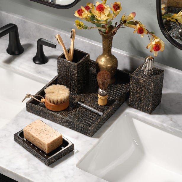 The edgy yet elegant look of the Hawen Tray Set in Dark Mushroom Faux Crocodile from Pigeon and Poodle is cast from authentic crocodile, giving it an eye-catchingly nuanced texture.