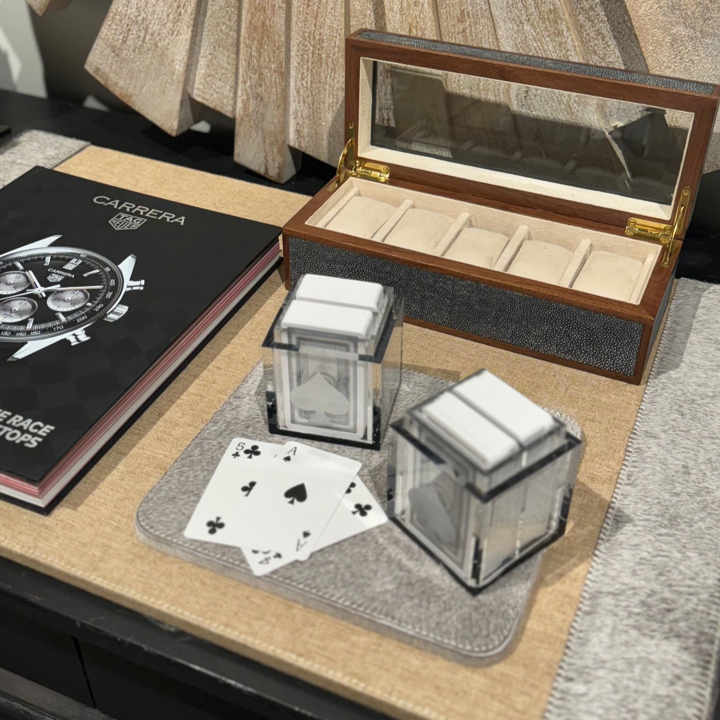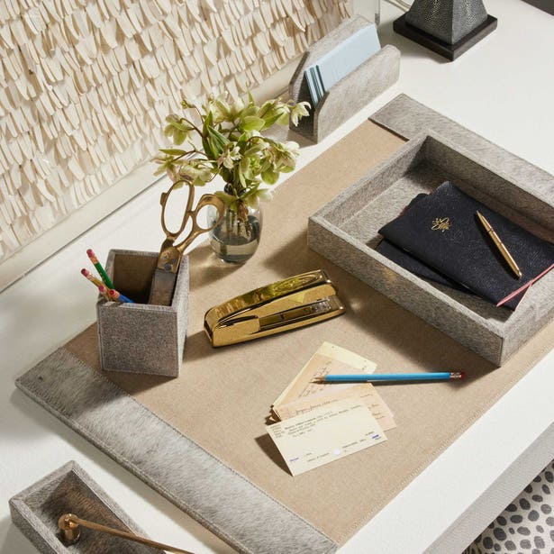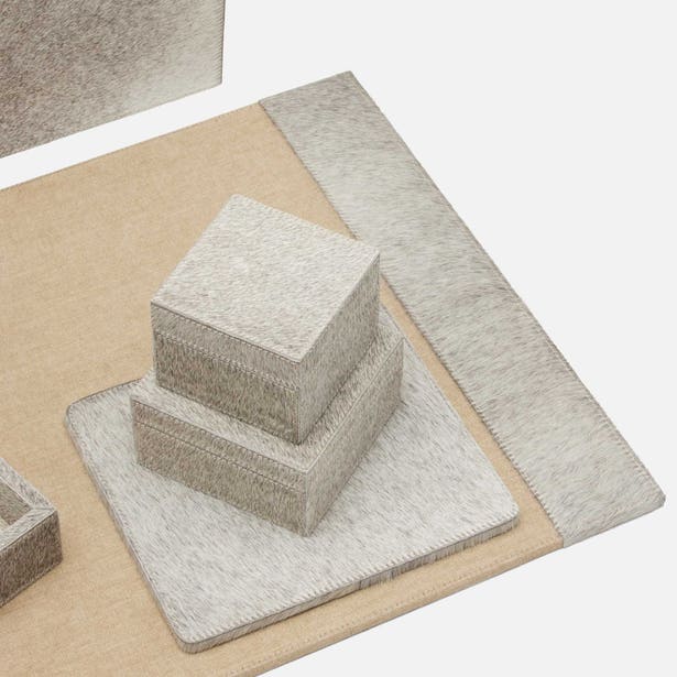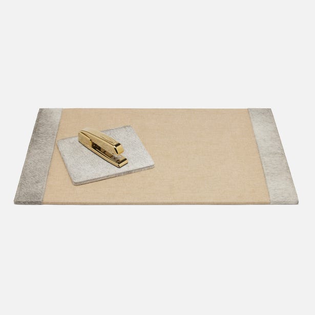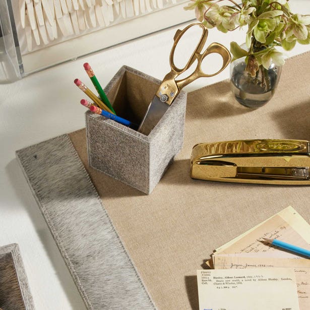 The Hyde Desk Blotter in Gray Hair on Hide from Pigeon and Poodle’s leather is paired with a subtle combination of texture and color that brings a worldly masculinity to the stateliest of studies.
