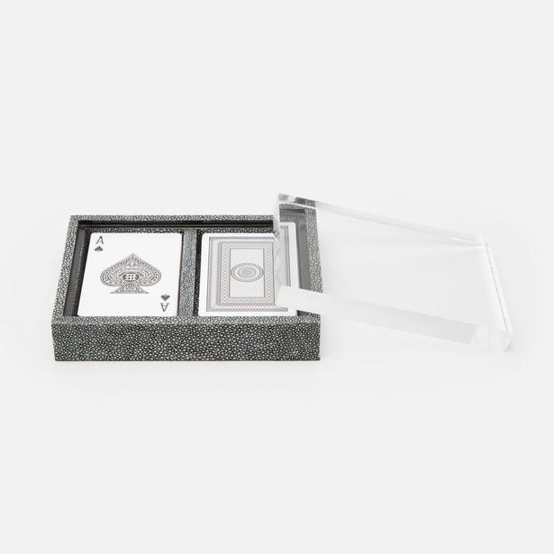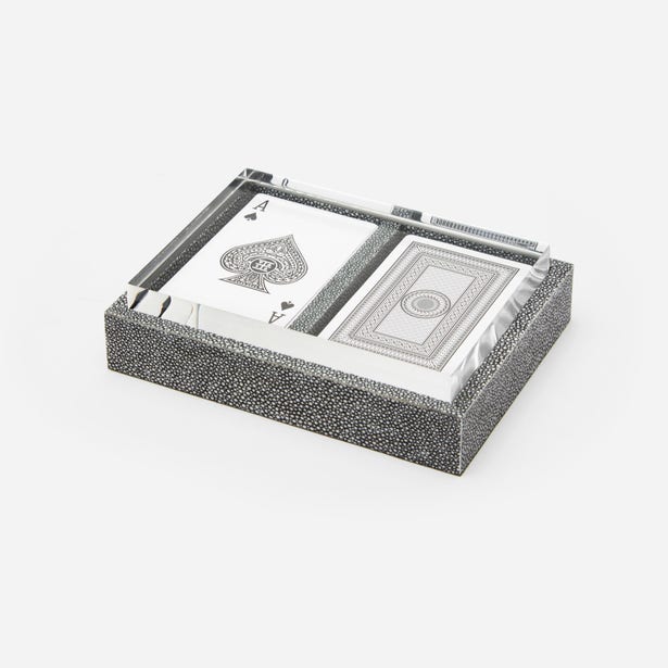 The Middelburg Card Holder Set in Cool Gray Shagreen from Pigeon and Poodle features a chic faux shagreen card holder with clear acrylic lid. The Middleburg Card Holder makes for an elegant display for two full deck of cards, perfect for entertaining as well as accessorizing.