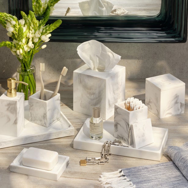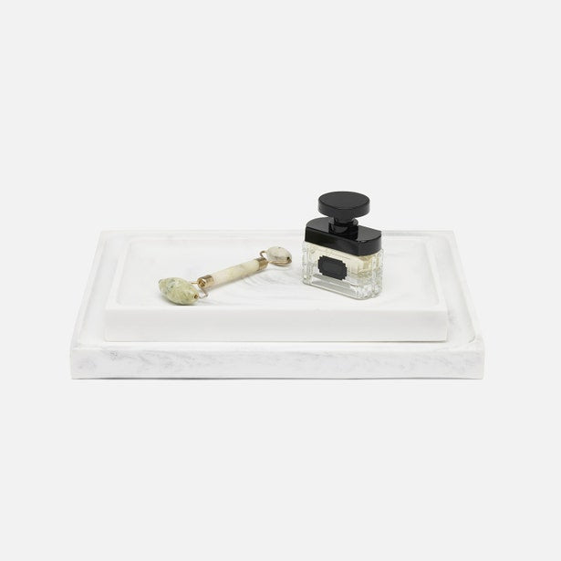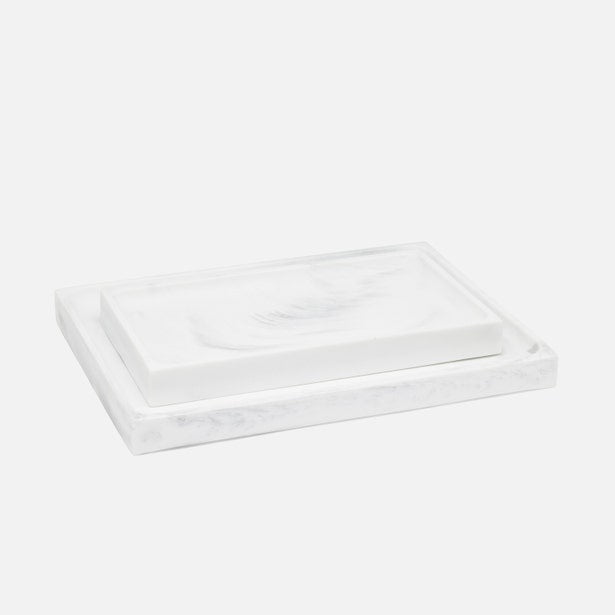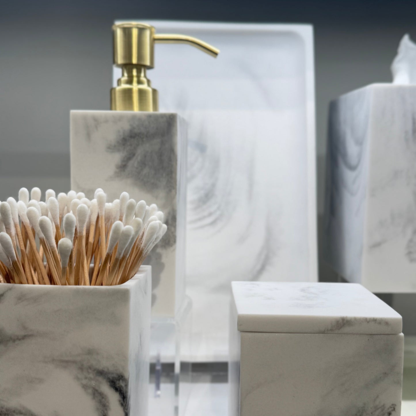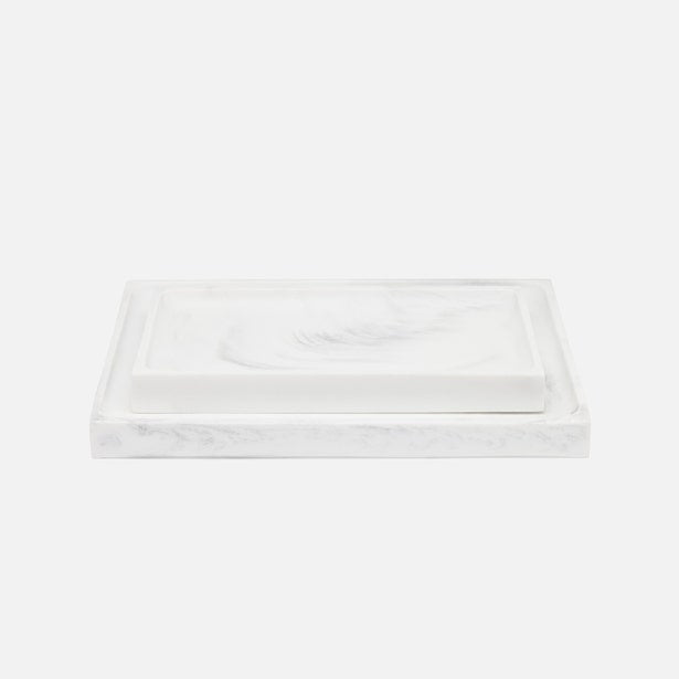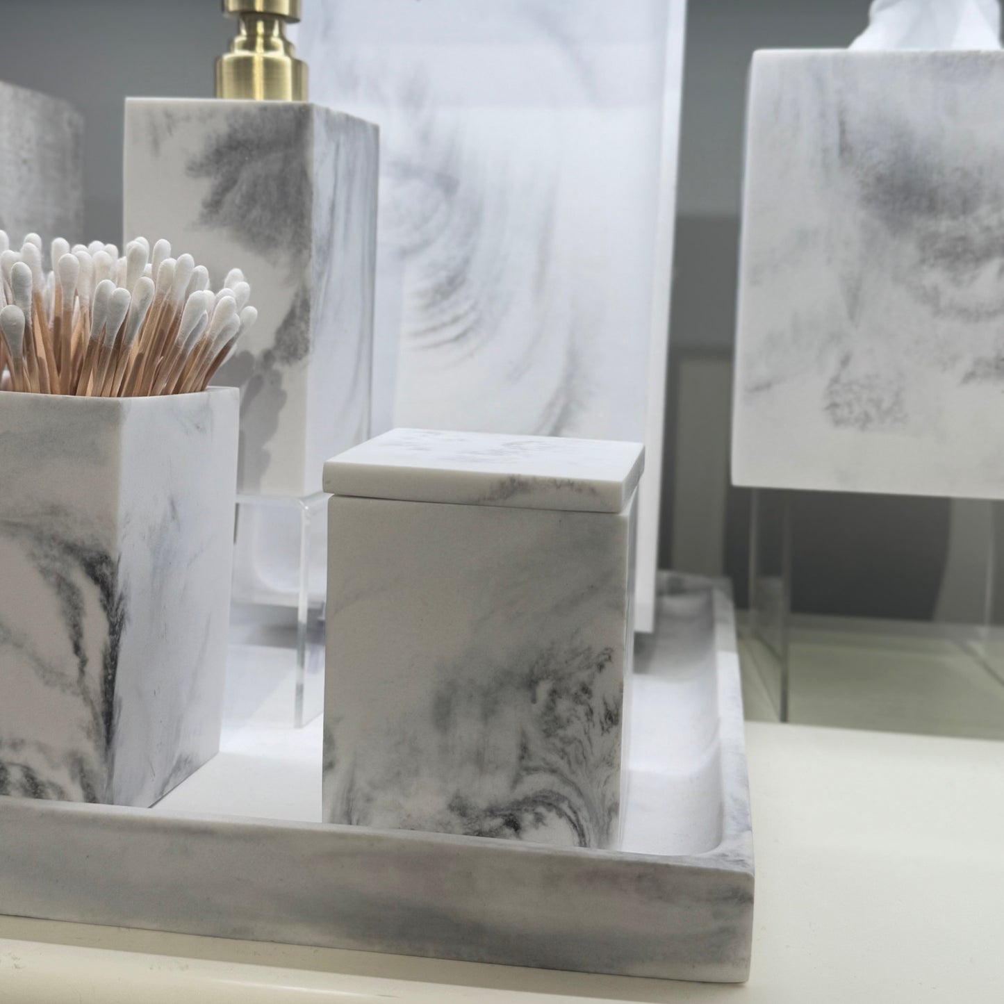 The Parma Tray Set in White Gray Swirled Resin from Pigeon and Poodle displays a beautiful and luxurious marble-like appearance, crafted with high-quality resin. Its elegant design makes it the perfect addition to any bathroom.