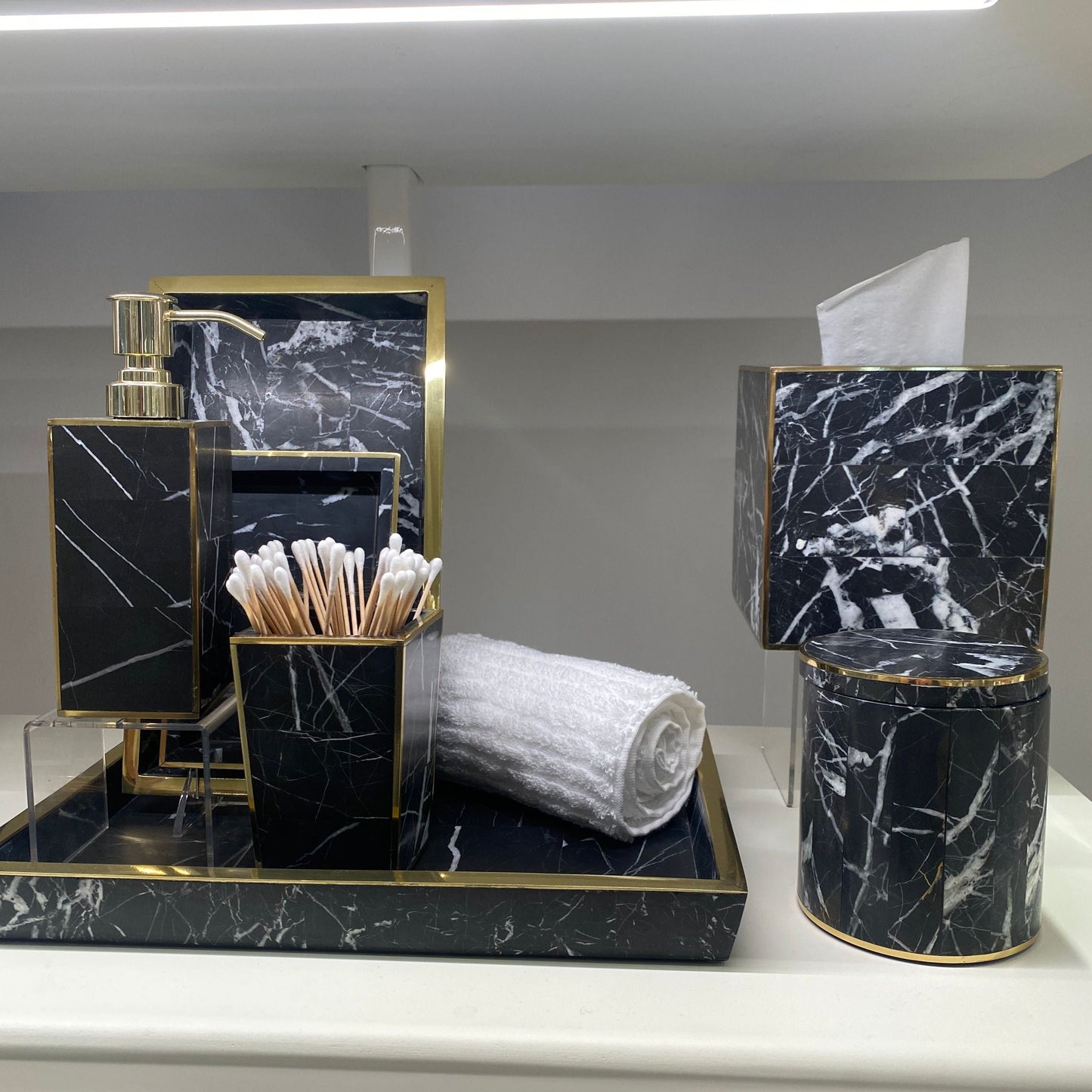 The Rhodes Tissue Box in Nero Marble and Brass Metal from Pigeon and Poodle features velvety, white-veined black marble that goes next level with handsome brass trim. Pair with all the luxurious pieces of the Rhodes Accessory Collection for the total look.