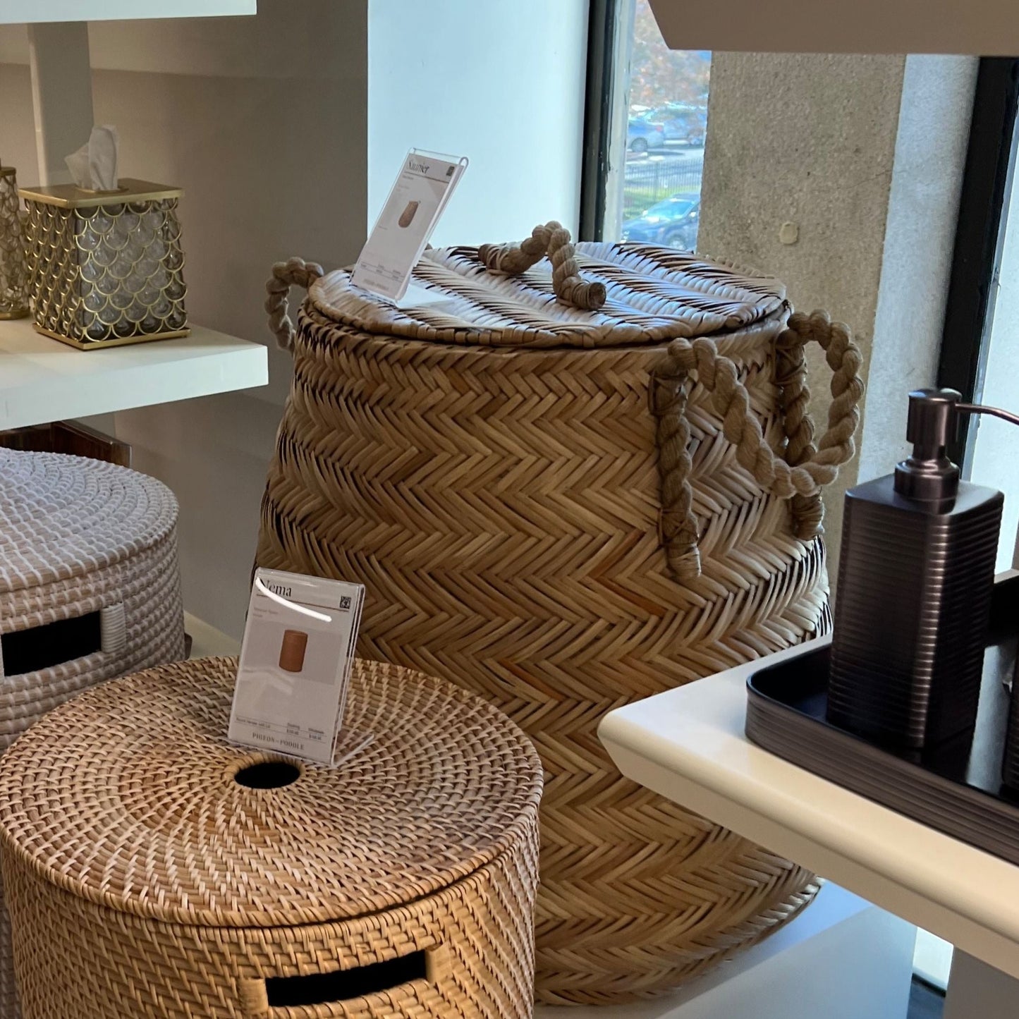 The oversized Saunier Hamper in Natural Rattan from Pigeon and Poodle features a chevron weave and nautical-inspired jute rope handles. This oversized basket is perfect for corraling items like blankets, towels, pillows, stuffed animals, or toys. Comes with a detachable lid.