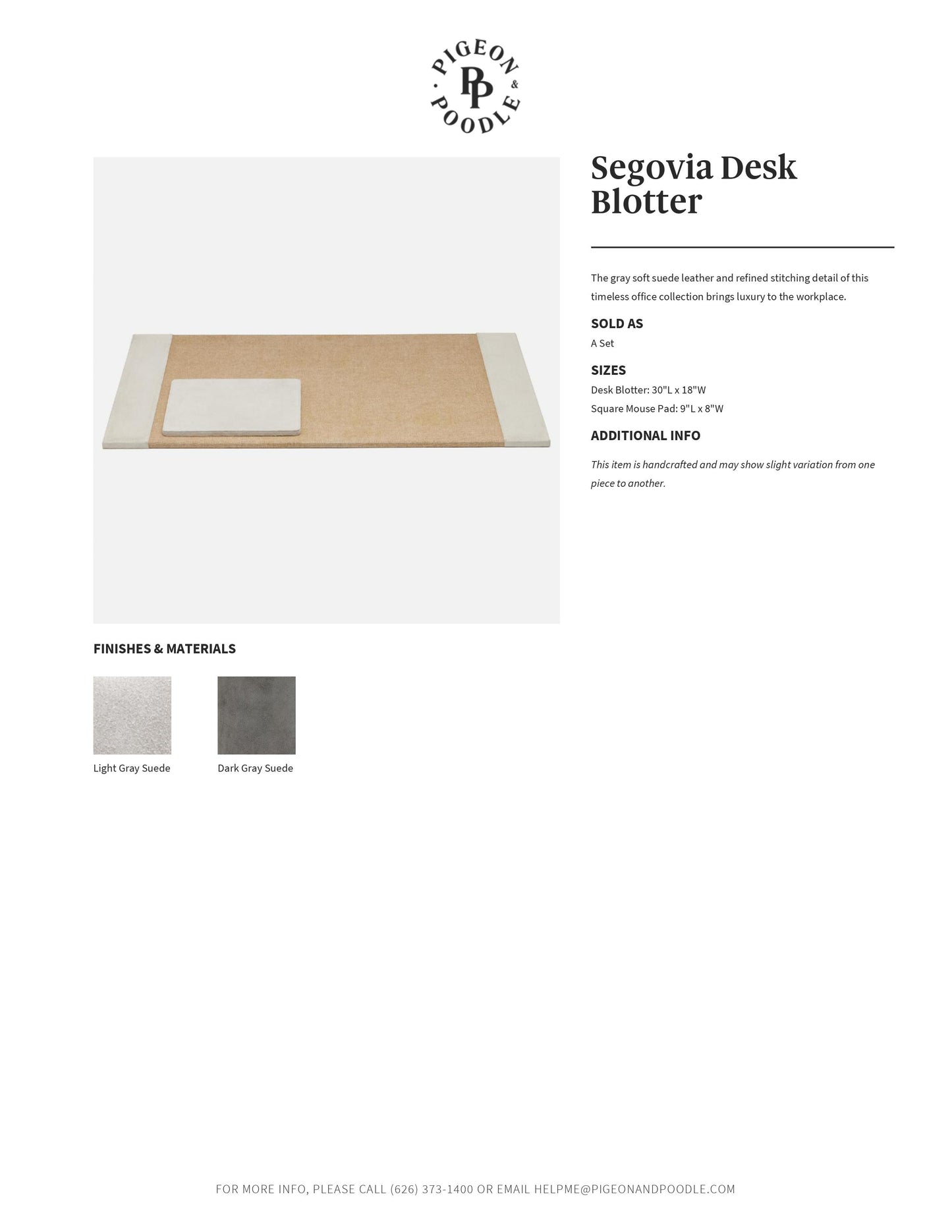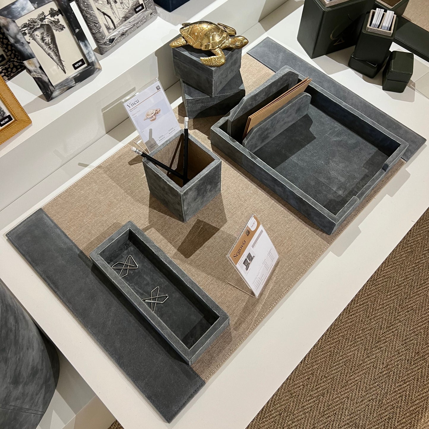 Bring luxury to the workplace with the Segovia Desk Blotter in Dark Suede from Pigeon and Poodle. The Segovia features gray soft suede leather and refined stitching detail which make up this timeless office collection.