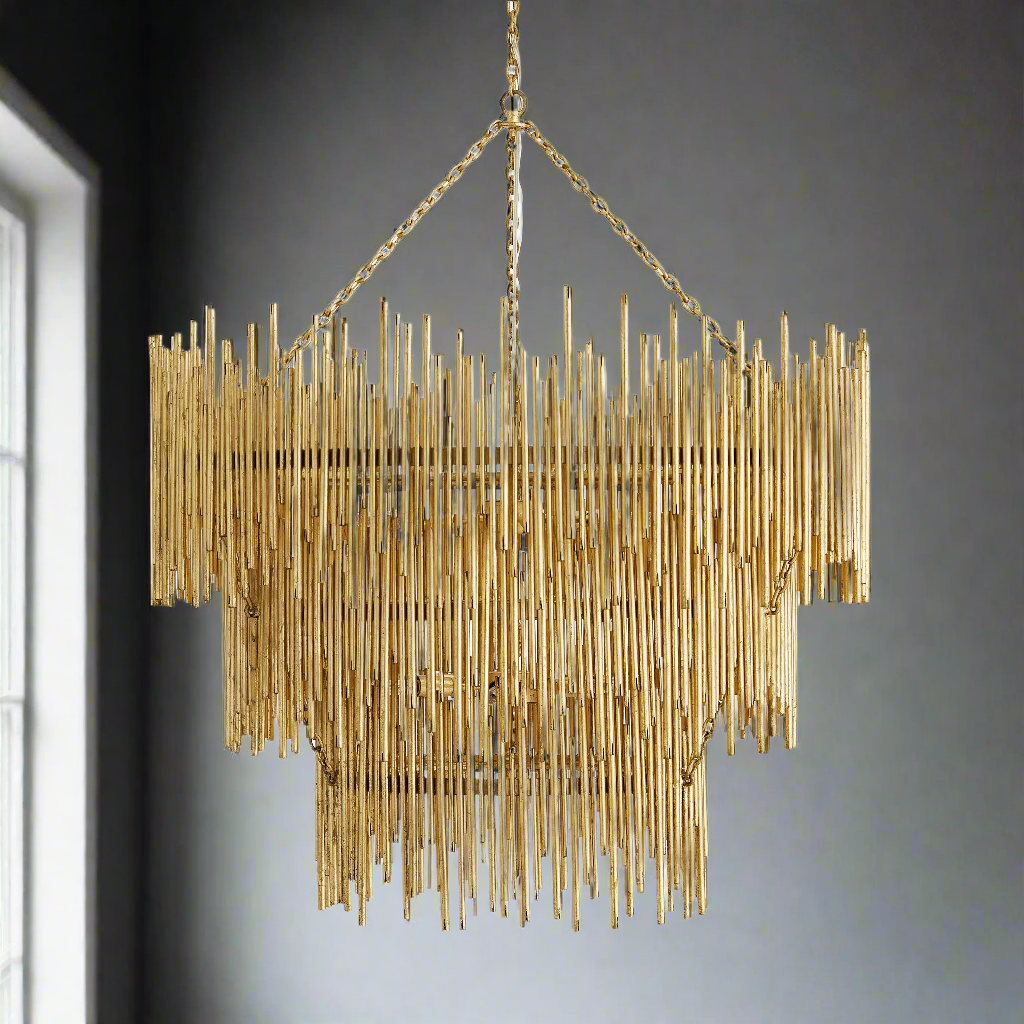 The Prescott Three Tiered Chandelier in Gold Leaf by Arteriors Home features welded iron rods forming a round and elegant fixture. Its hand-finished gold leaf application creates a sophisticated and unique chandelier, with a varying finish for a custom touch.