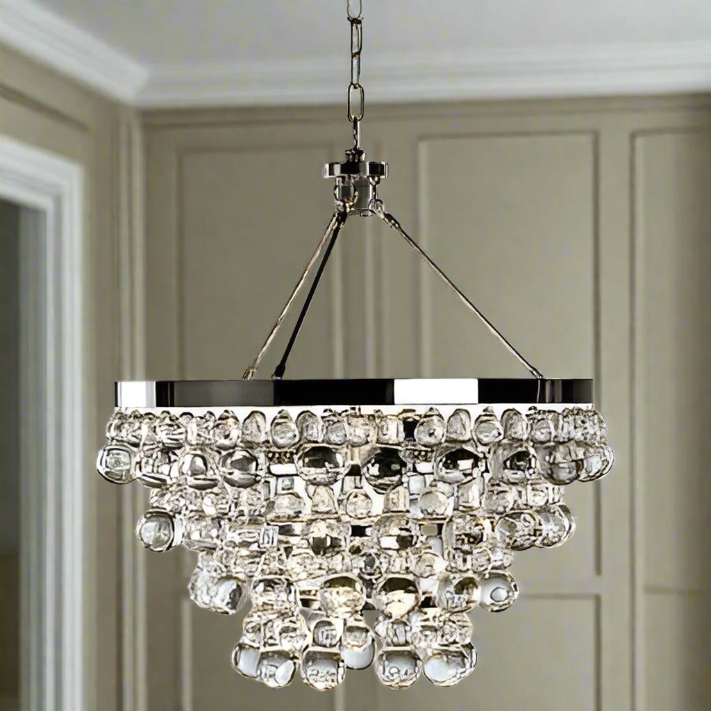 The glamorous Bling Chandelier by Robert Abbey features a radiant array of clear glass drops suspended from a polished nickel finished metal frame. This stunning light fixture will create a warm and inviting glow over a dining table, in a foyer, in a master bath, or wherever it is used. The Bling Chandelier can also be converted into a semi-flush mount.