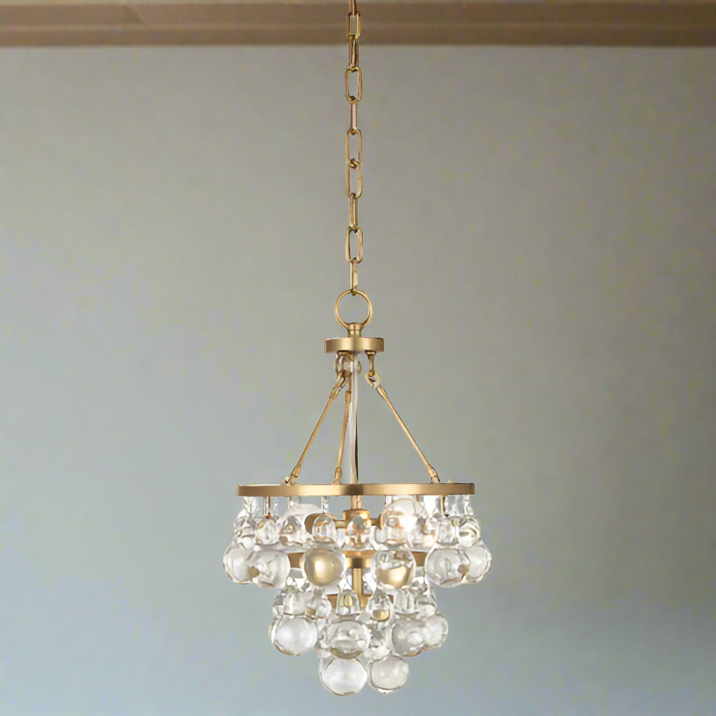 The Robert Abbey Bling Small Chandelier in Antique Brass is shown in a petite size perfect for smaller spaces like a powder room or hallway. The glass and metal construction make this glass chandelier gorgeous and even more beautiful when lit up.