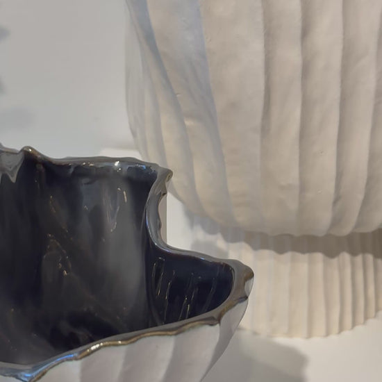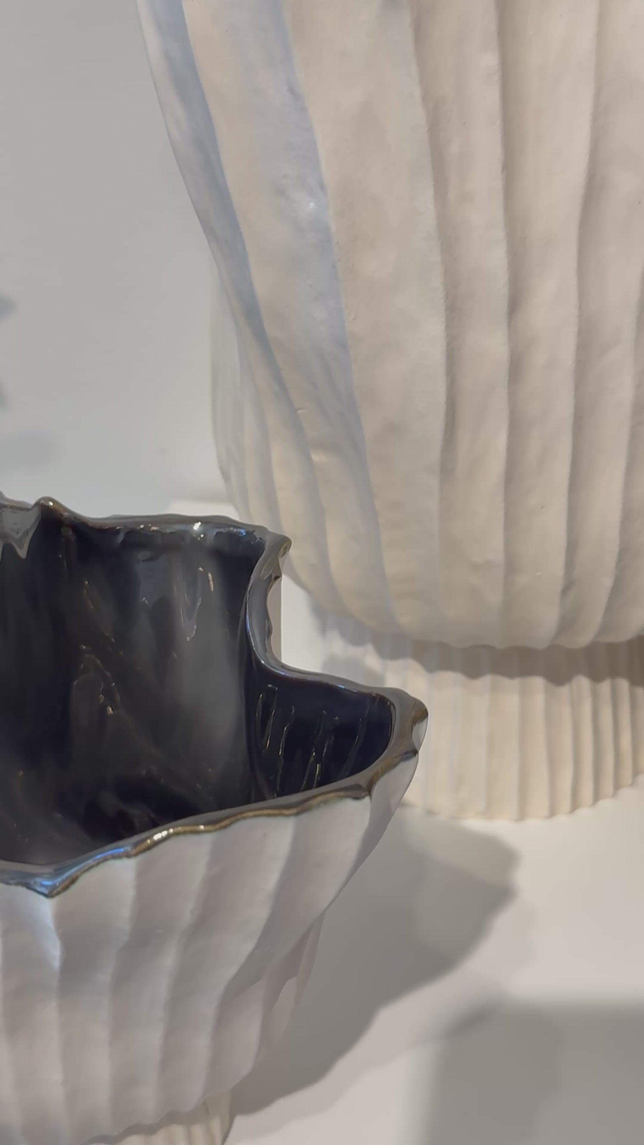 The Global Views' Folha Large Vase in Off White by Studio A showcases Portuguese ceramic craftsmanship with an organic footed silhouette and hand-painted metallic interior. The neutral finish pairs seamlessly with curated interiors while the luminous interior detail transforms it into a sculptural accent piece.