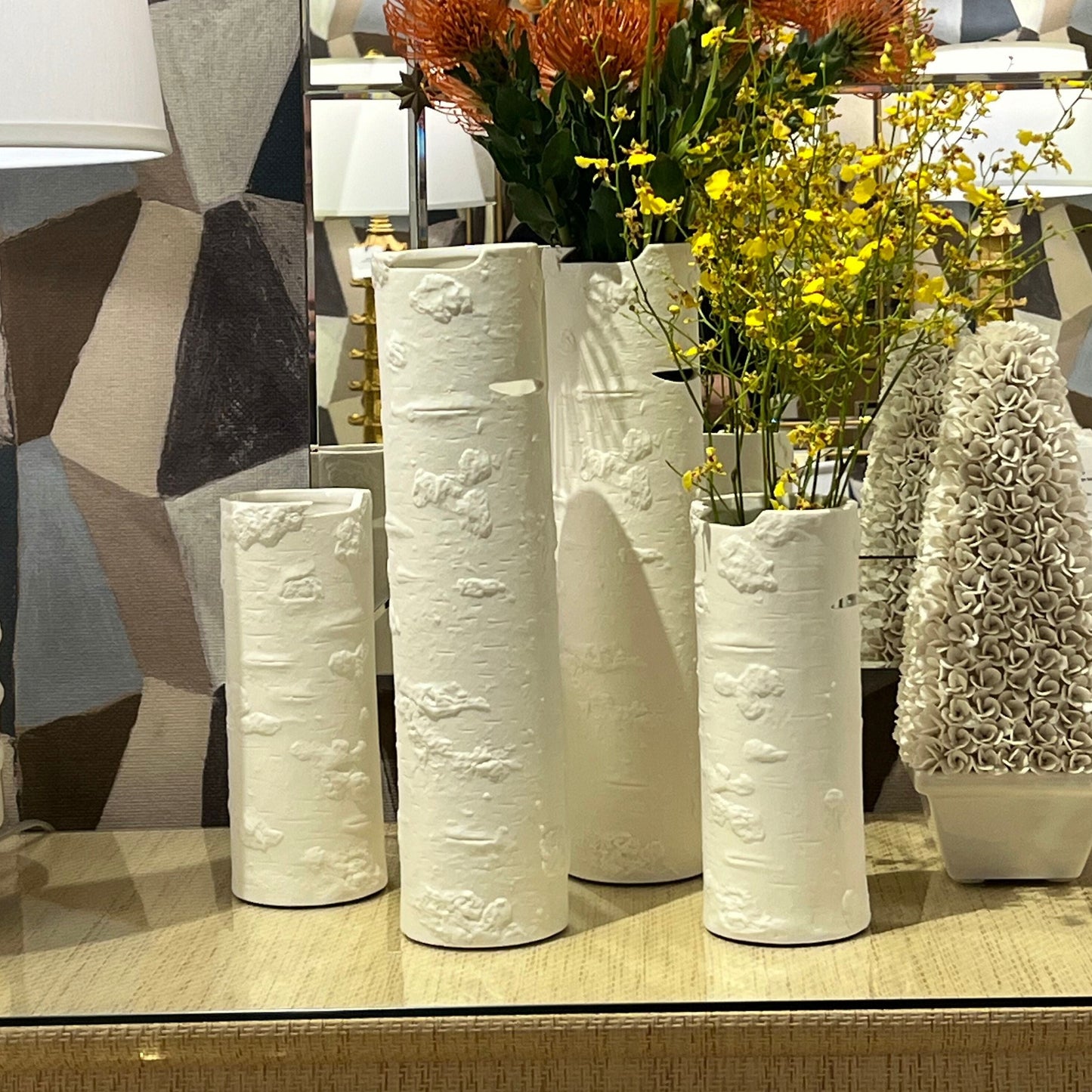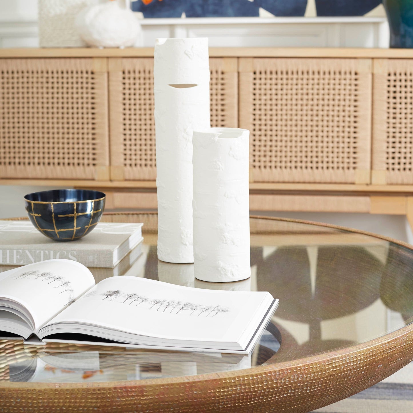 The Aspen Medium Vase in Blanc De Chine from Villa & House features a matte glaze and lifelike bark texture, offering a creative way to display floral arrangements. Its slim, notched design mimics tree knots, reflecting the beauty of a gentle woodland. Complete the look with the Aspen Tall Vase.