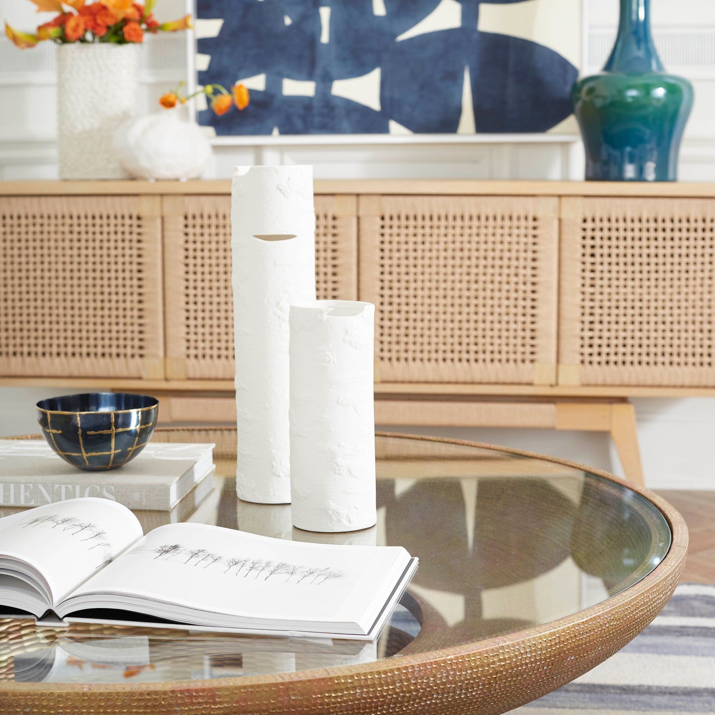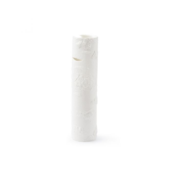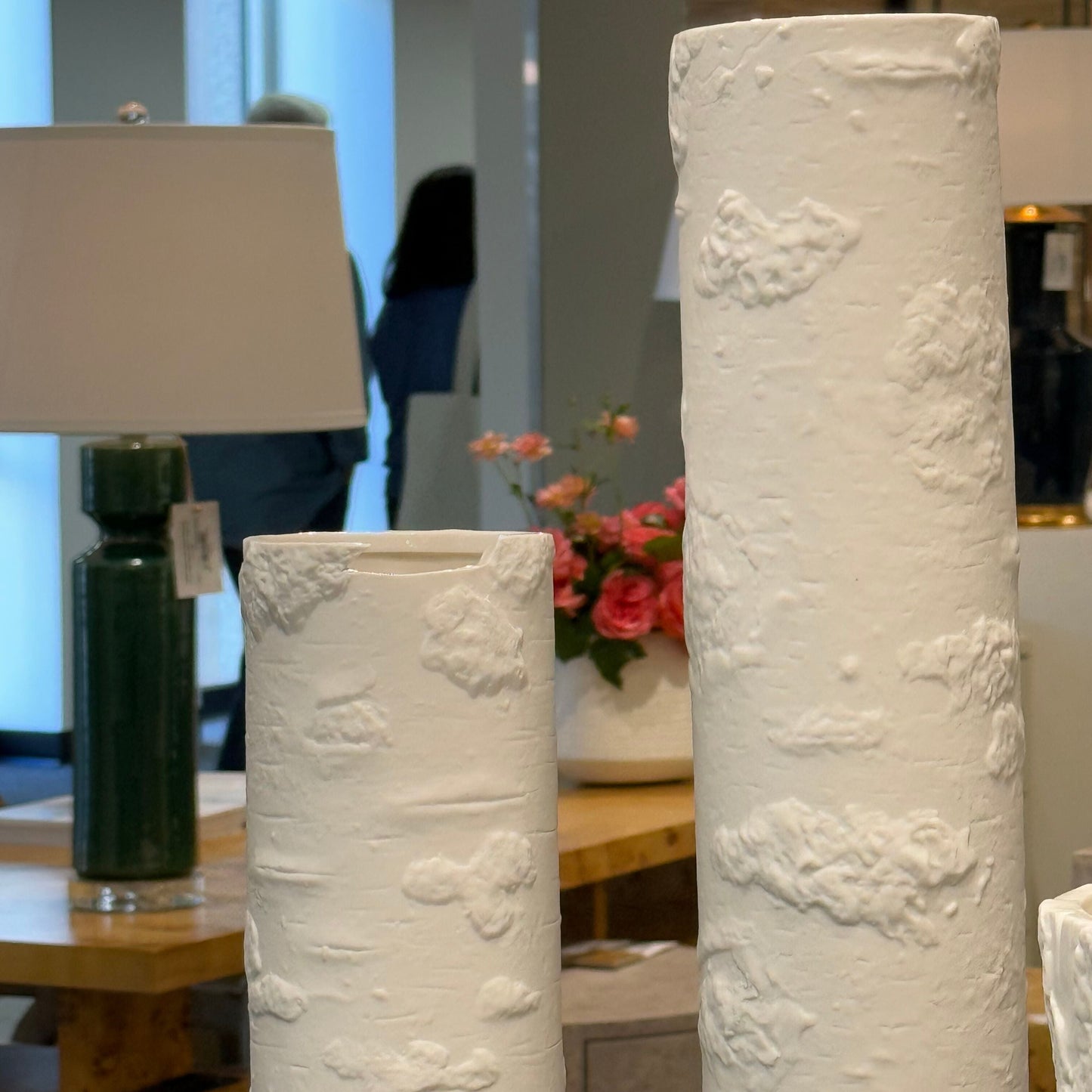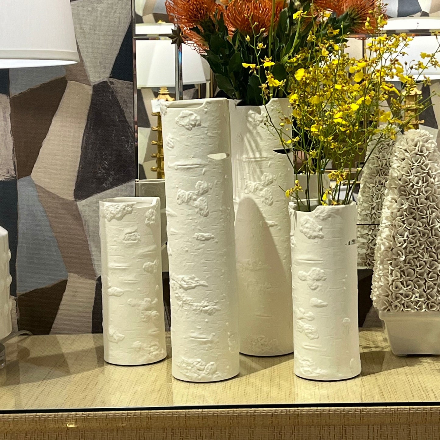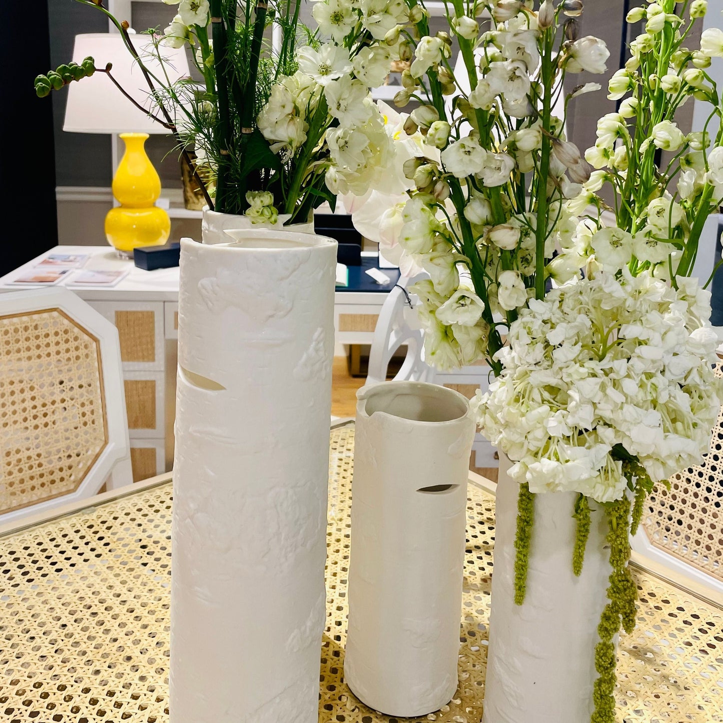 The Aspen Tall Vase in Blanc De Chine from Villa & House features a matte glaze and lifelike bark texture, offering a creative way to display floral arrangements. Its slim, notched design mimics tree knots, reflecting the beauty of a gentle woodland. Complete the look with the Aspen Medium Vase.