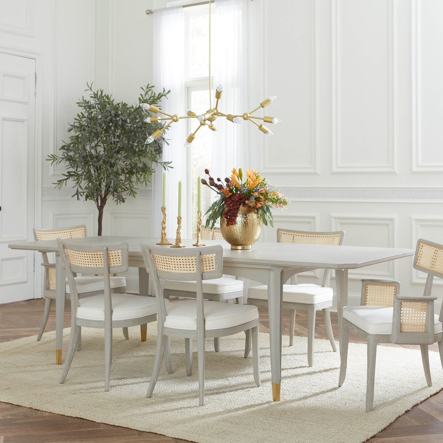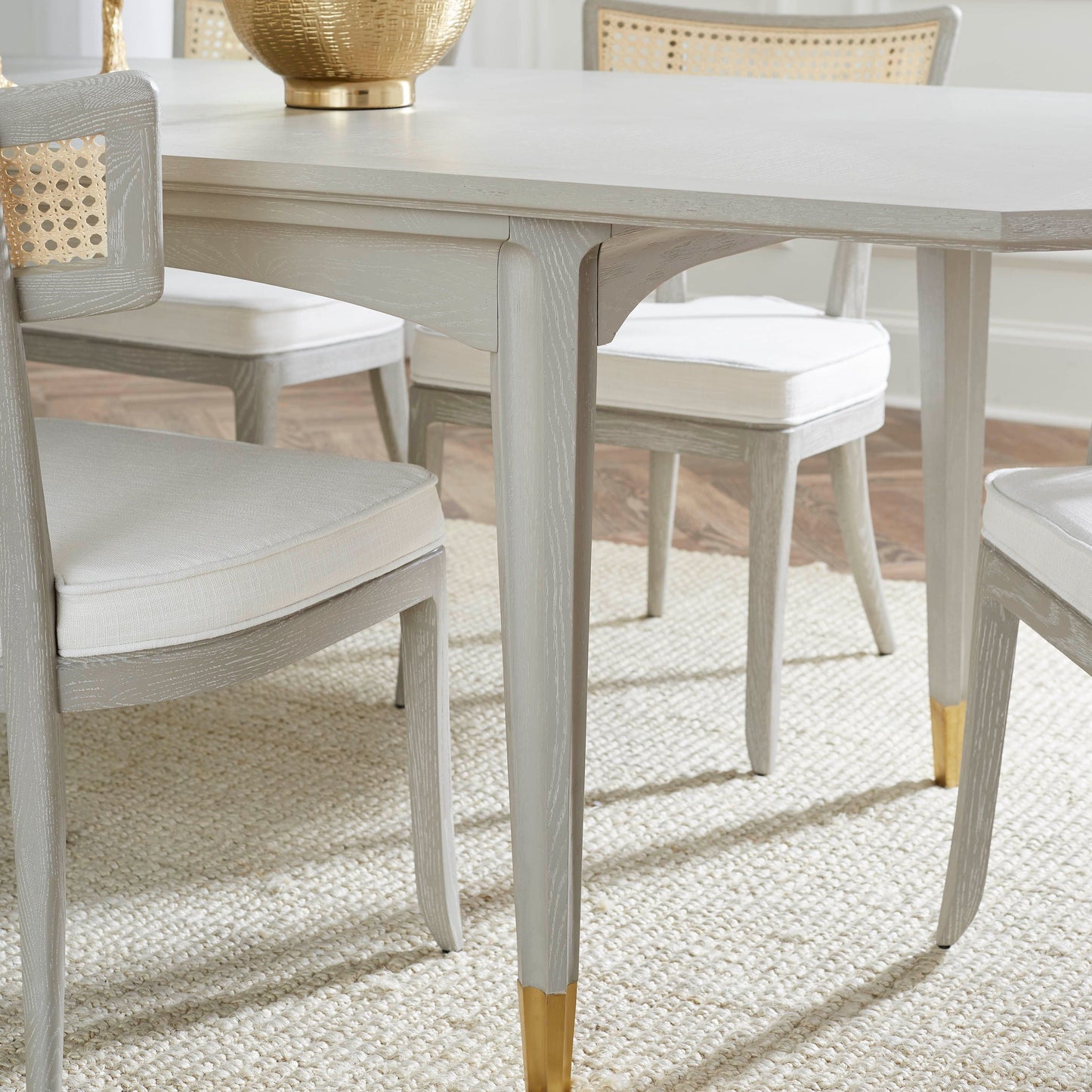 The Bertram Dining Table Sand by Villa & House includes extendable, angled corners for a softer look. The soft gray clear lacquered bleached cerused oak and solid quarter-sawn oak legs, expertly sanded to taper with double-sided coving, add refined bronze sabots for a stylish touch.