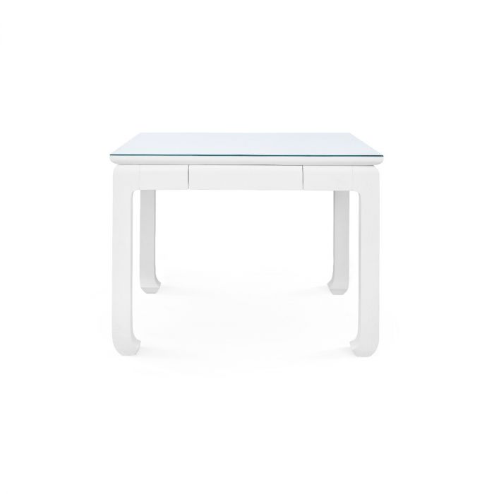 With harmonious proportions and chow-styled feet, the Bethany Game Table in Vanilla from Villa & House is finished in a textural, lacquered heavy linen that almost reads like plaster. The square table has four drawers on each side of the table and is topped with a glass top.