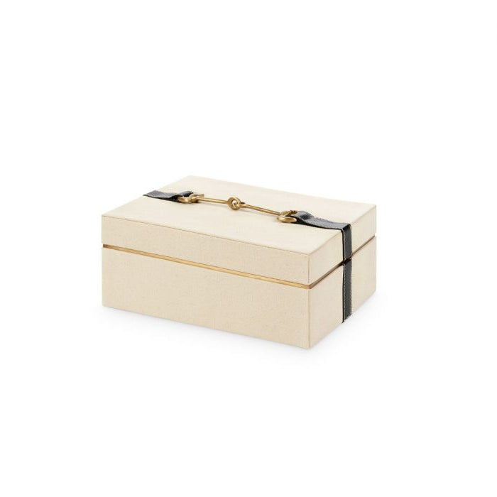 The Buckley Rectangular Box in Black by Villa & House has a canvas exterior, accented by a top-stitched leather ribbon and antique brass horse bit detail. Its felted underside protects delicate surfaces.