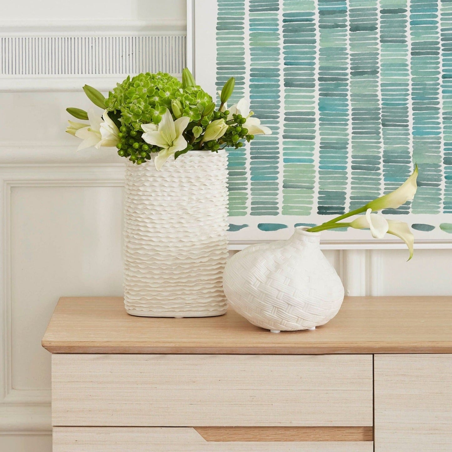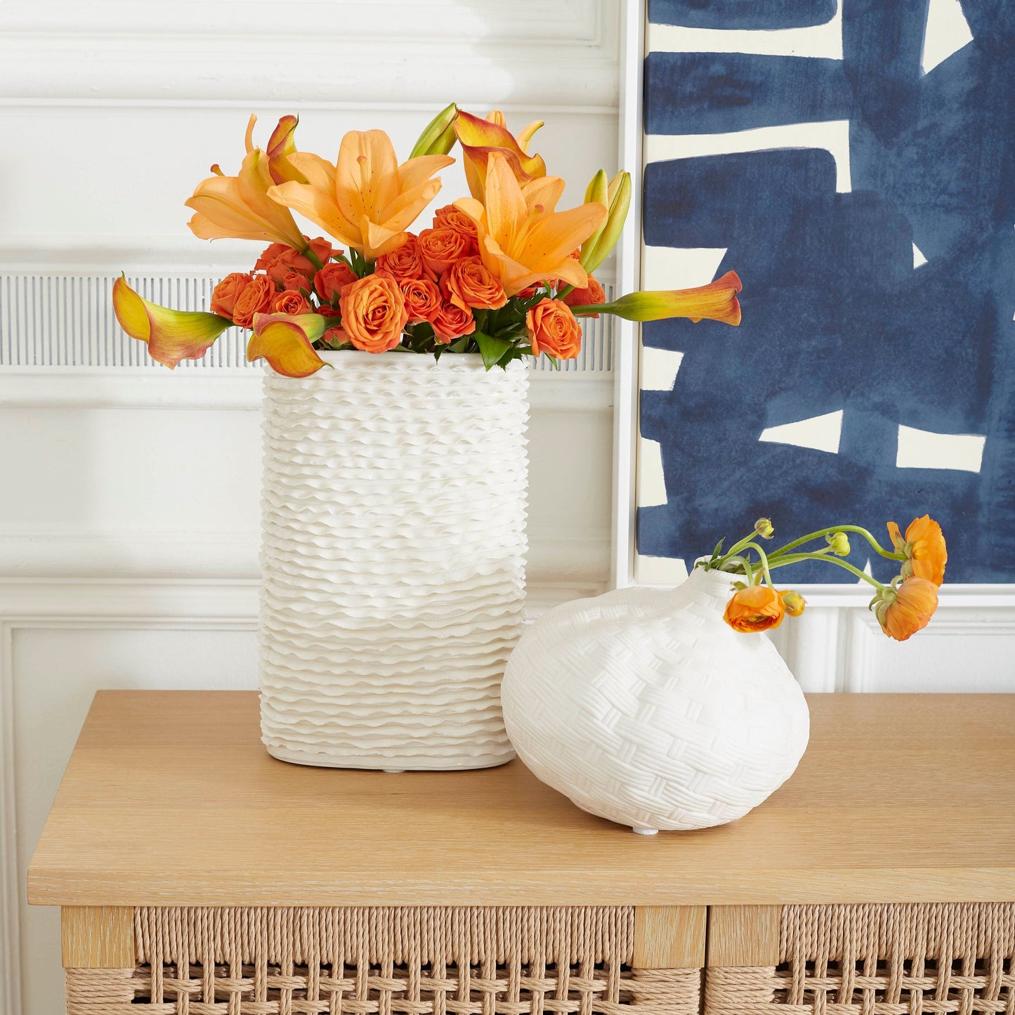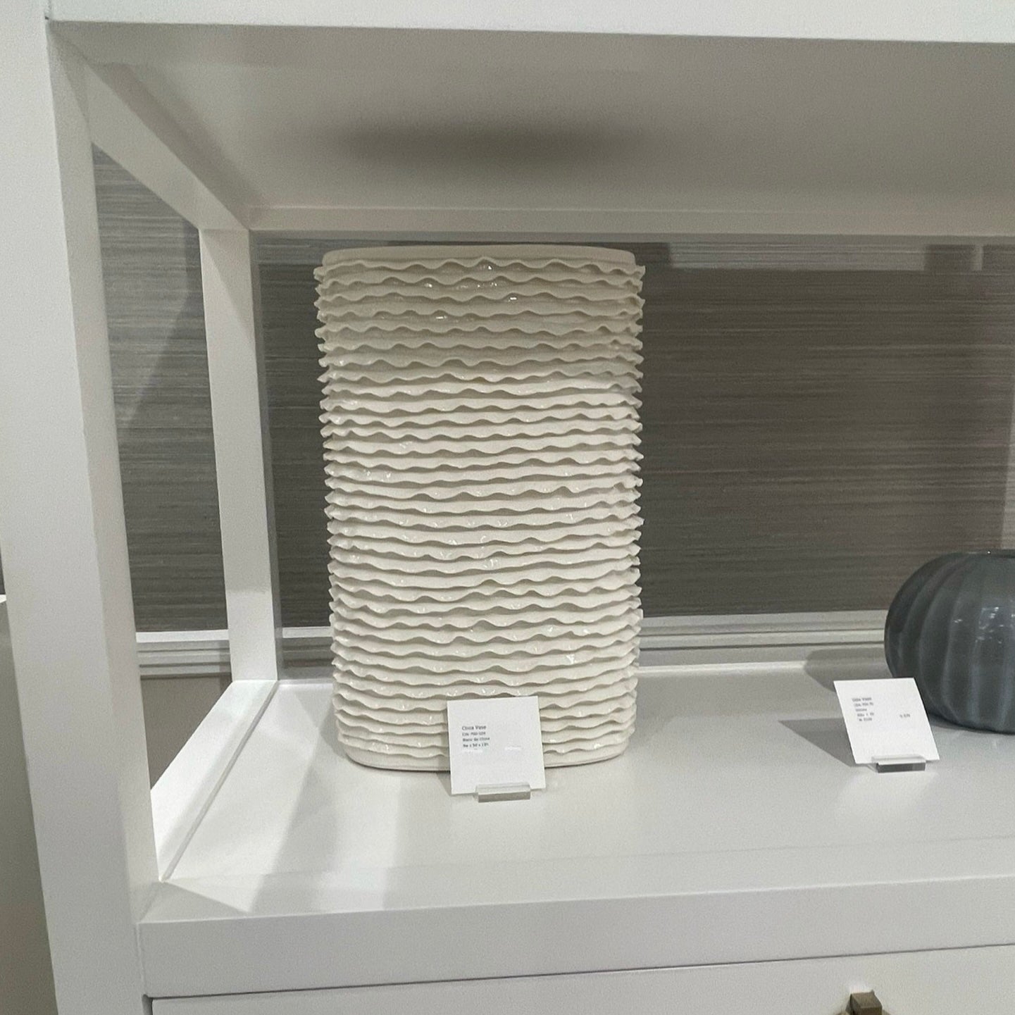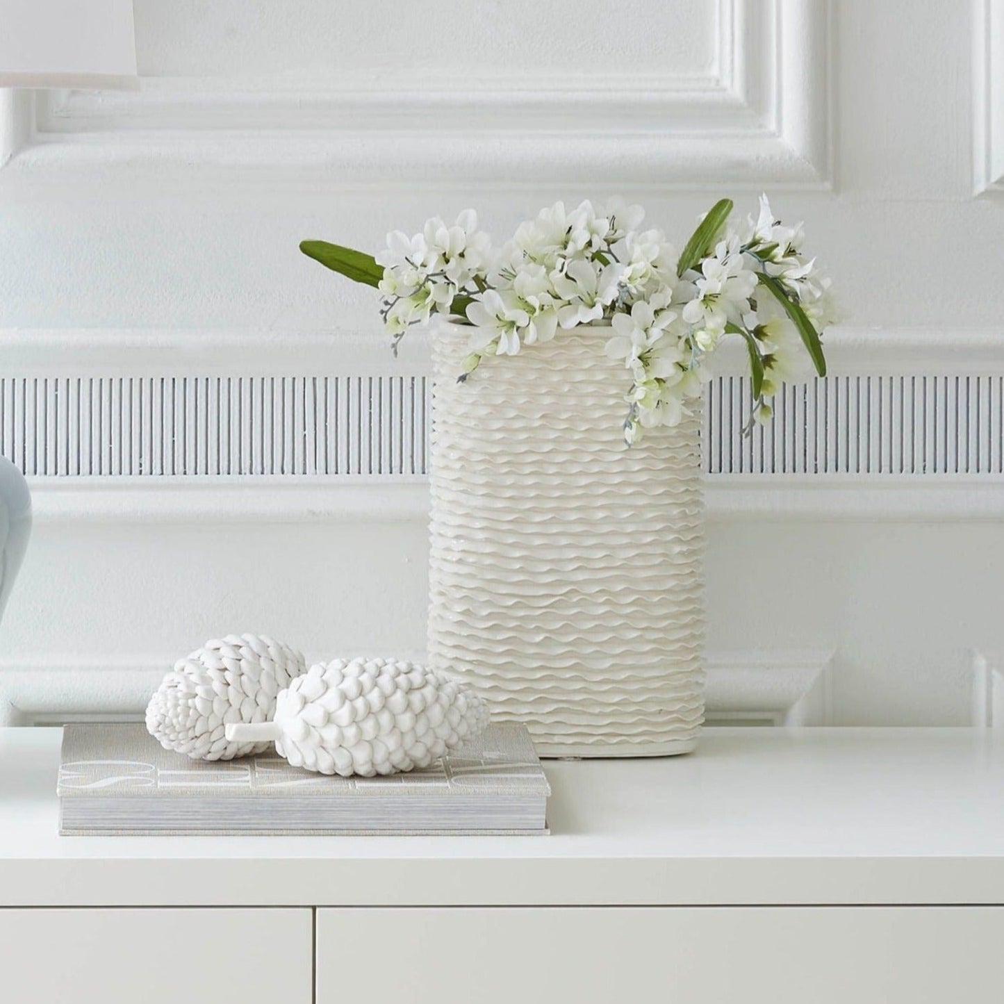 Experience the elegant beauty of light with the Cinta Vase Blanc De Chine from Villa & House. Delicate ribbons of Blanc de Chine porcelain gracefully encircle an oblong column, creating a dynamic interplay of light and shadow. This exquisite vase is a nod to the timeless charm of 1930s Italian design, completed with a glossy finish.