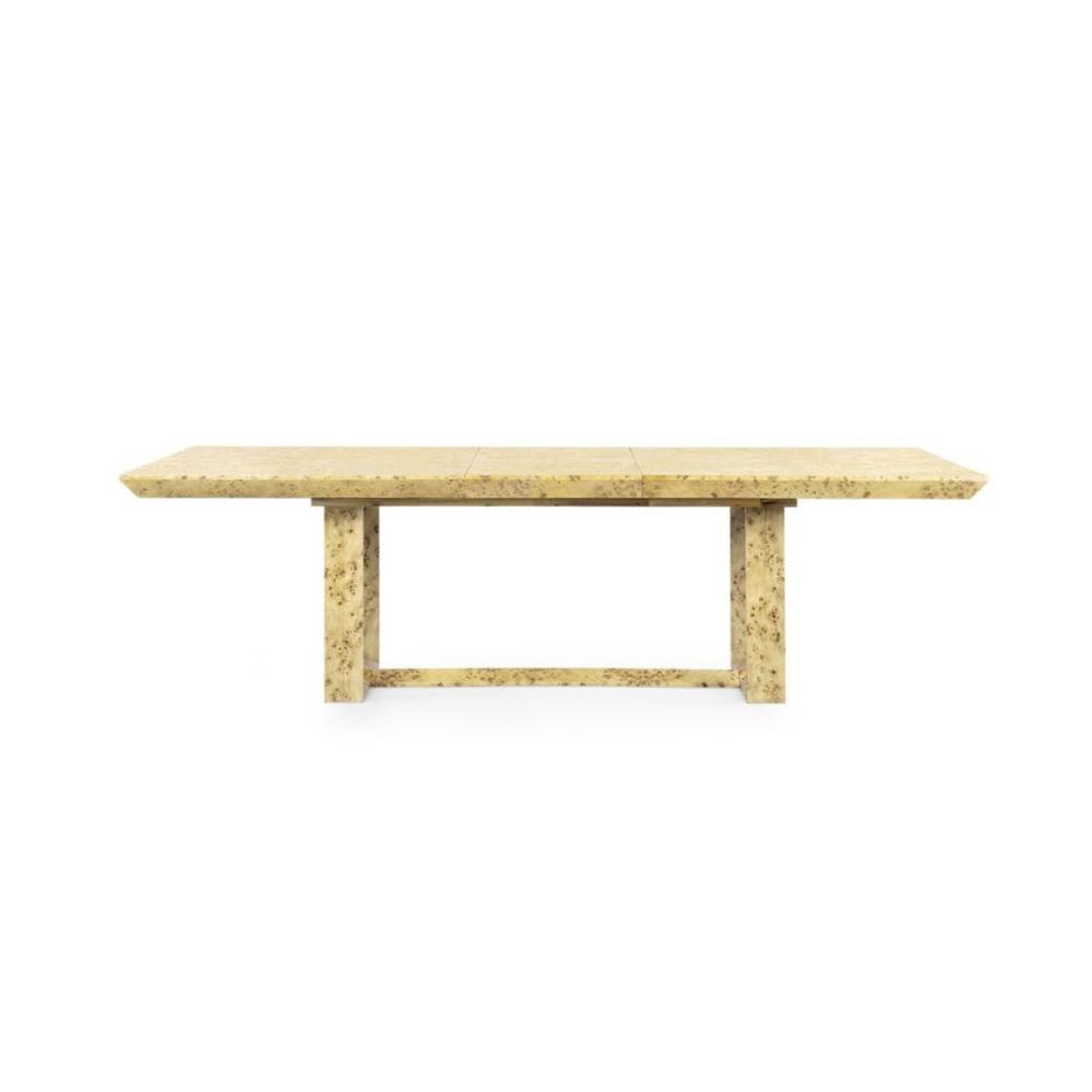 The Easton Dining Table in Burl from Villa & House combines deco-inspired elegance with architectural design. Its traditional rectilinear silhouette exudes a timeless sophistication. Made with Burlwood and equipped with two leaves, it provides versatility for seating arrangements with a leaf conveniently stored underneath.