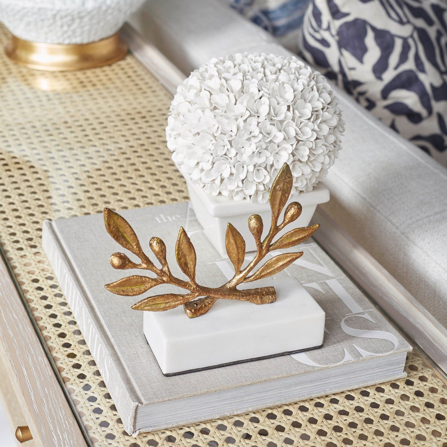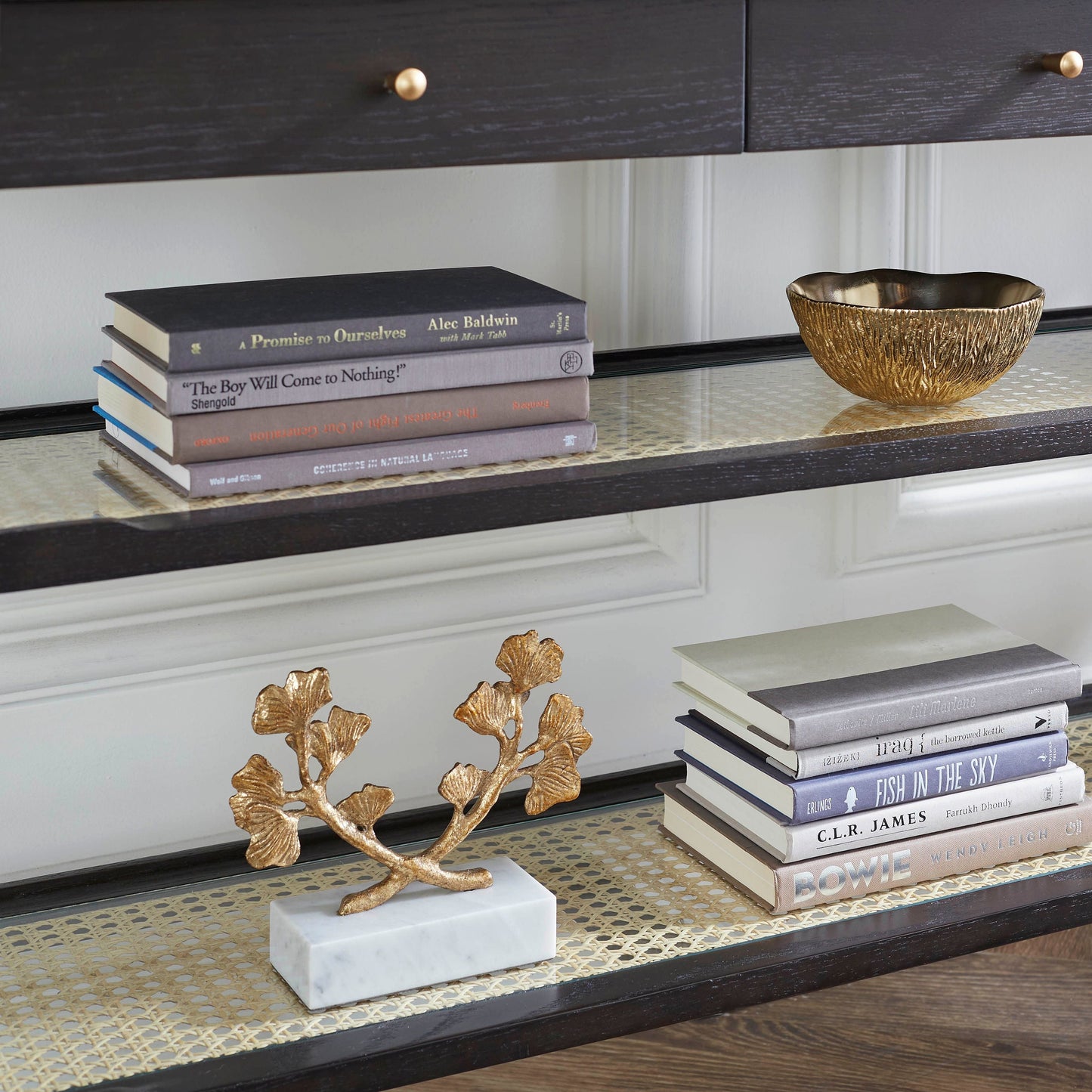 The Ginko Statue in Gold Leaf from Villa & House is a beautiful artistic rendering of two Ginko leaves mounted on a base of white marble and finished with hand-applied gold leaf. In Japan, the fan-shaped Ginko leaf symbolizes health, resilience, and longevity.