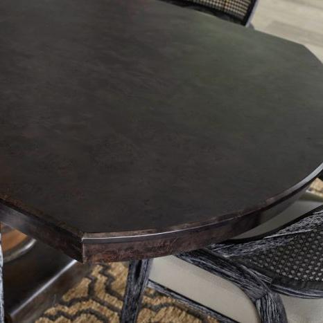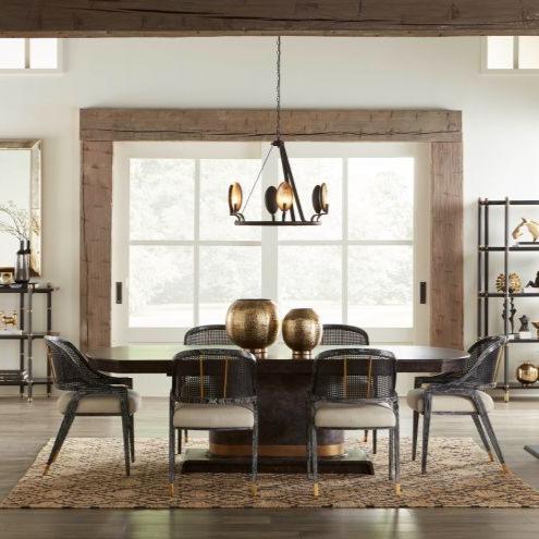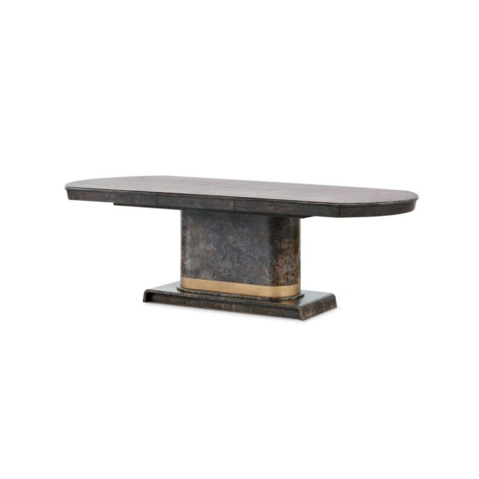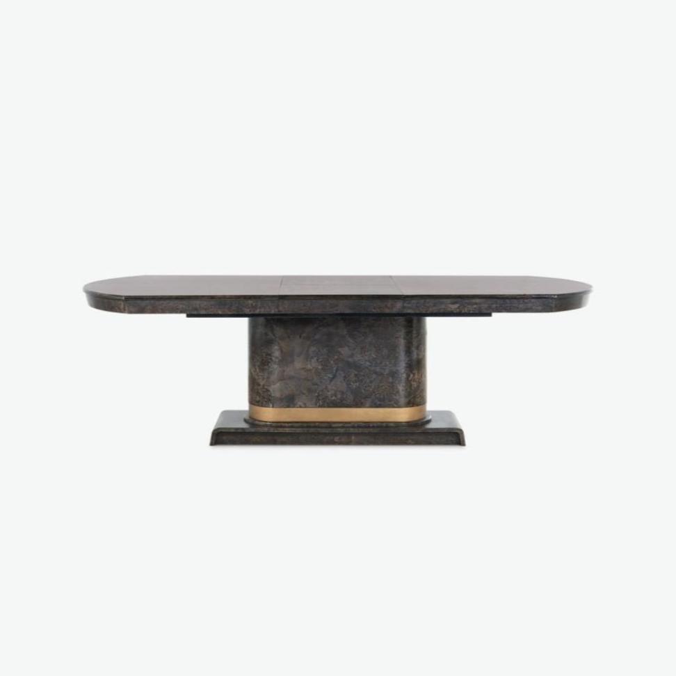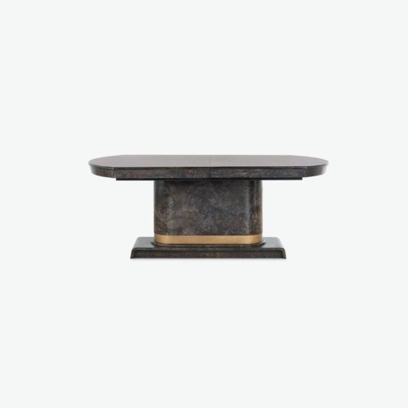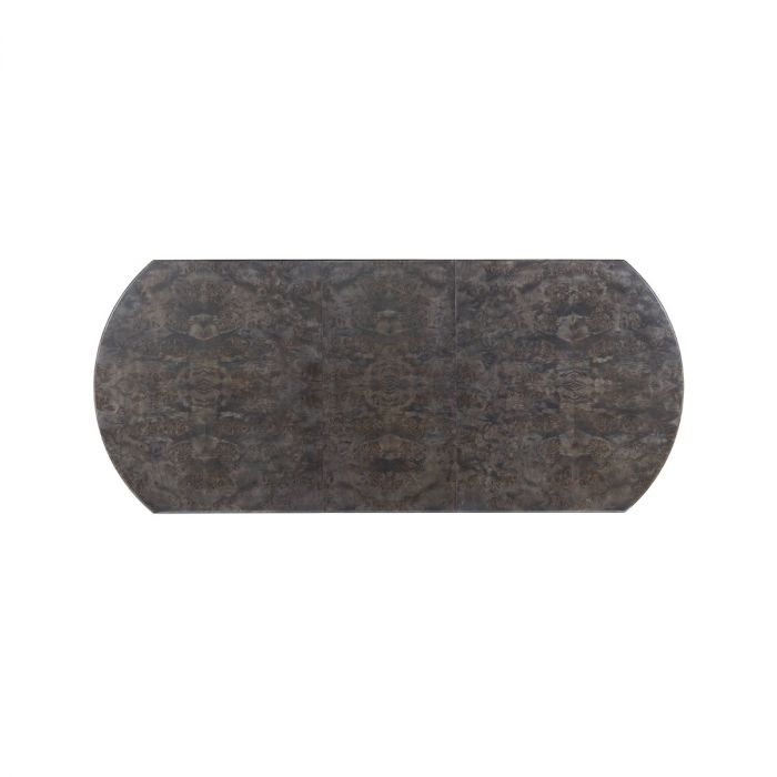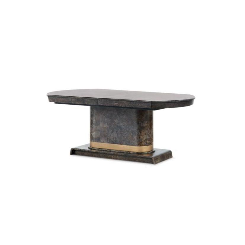 Embodying an air of sophistication, the Harriet Dining Table in Arabica Burl from Villa & House features a striking arabica finish. A glimmering brass sash at the base of its center column adds a stylish touch, while the included extension leaf, conveniently stored in the base, allows for easy accommodation of additional guests.