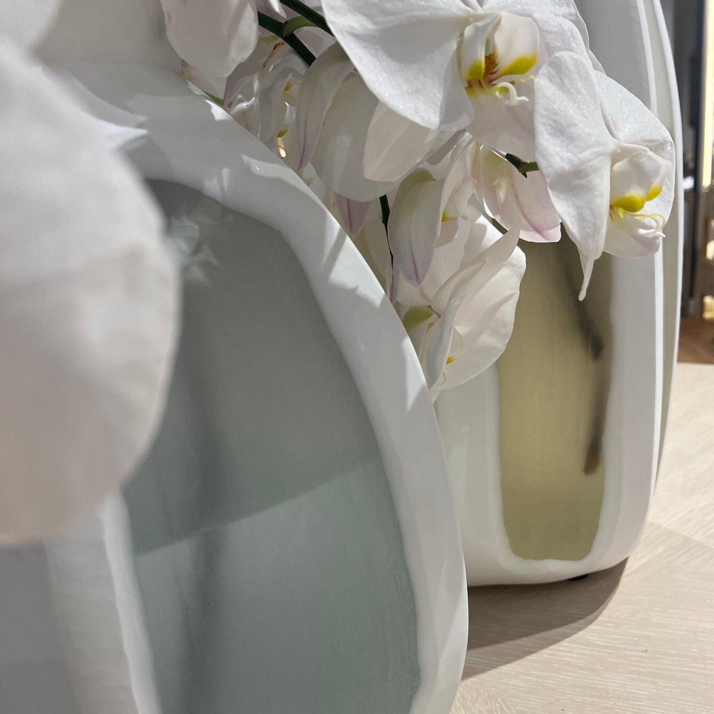 The Helsinki Large Vase in Powder White from Villa & House embodies the wabi sabi philosophy with a beautifully unfinished design. The white and transparent exterior perfectly blend, creating an exquisite representation of imperfection as an art form.