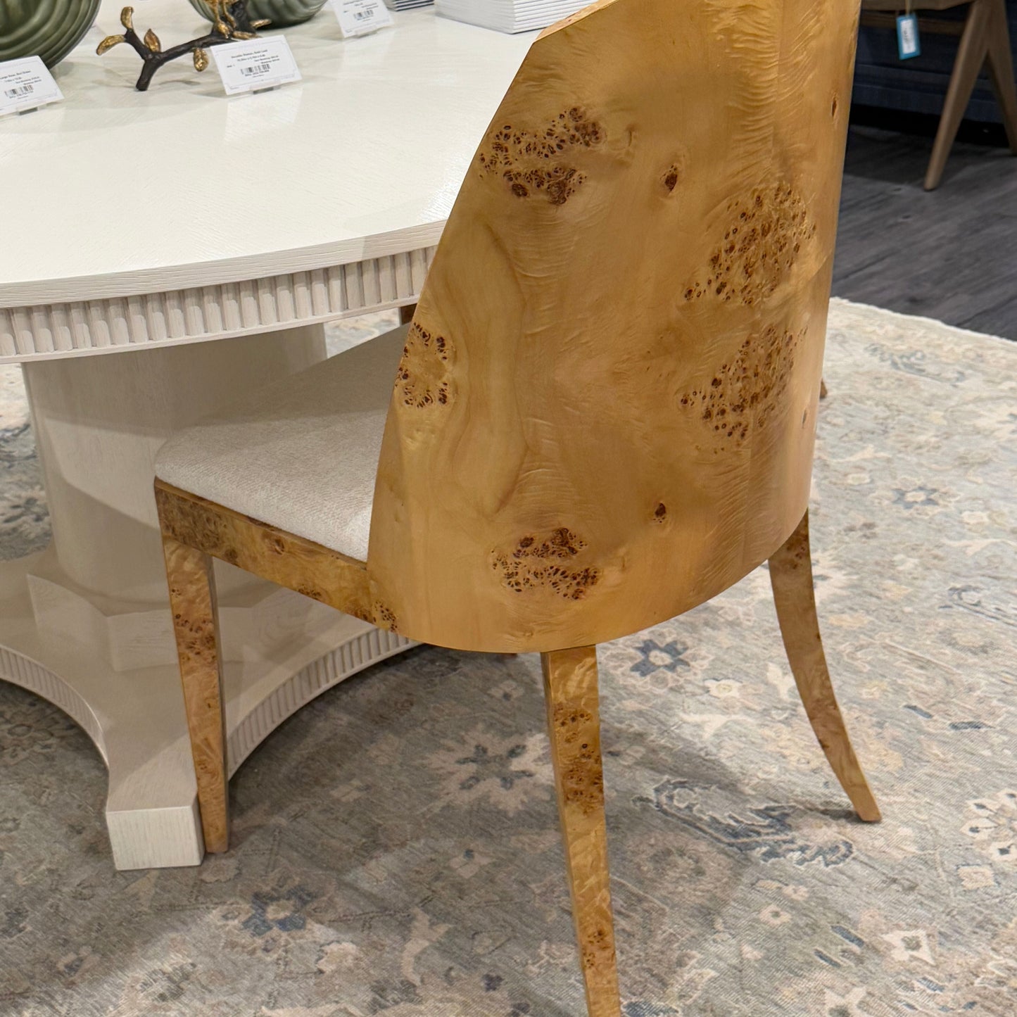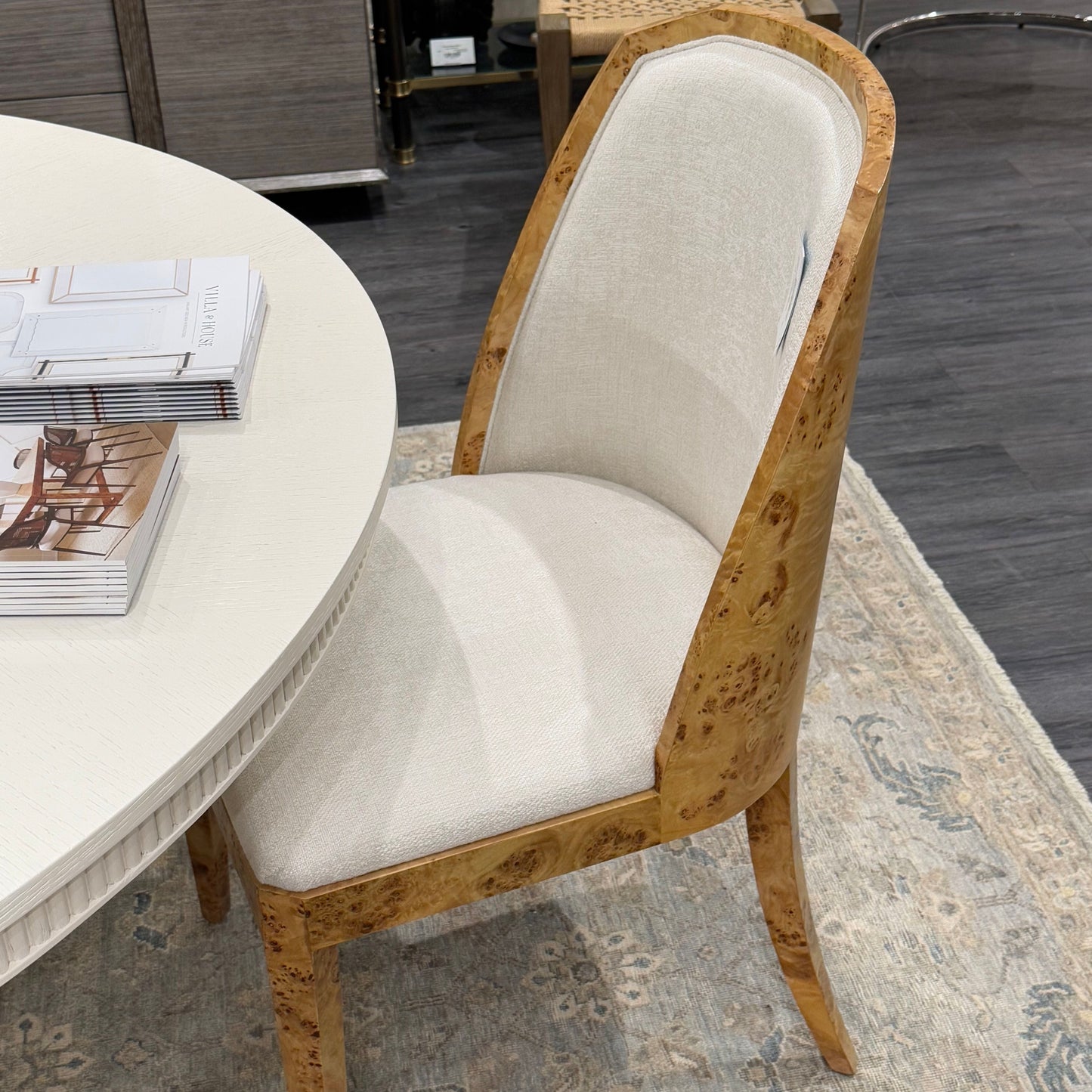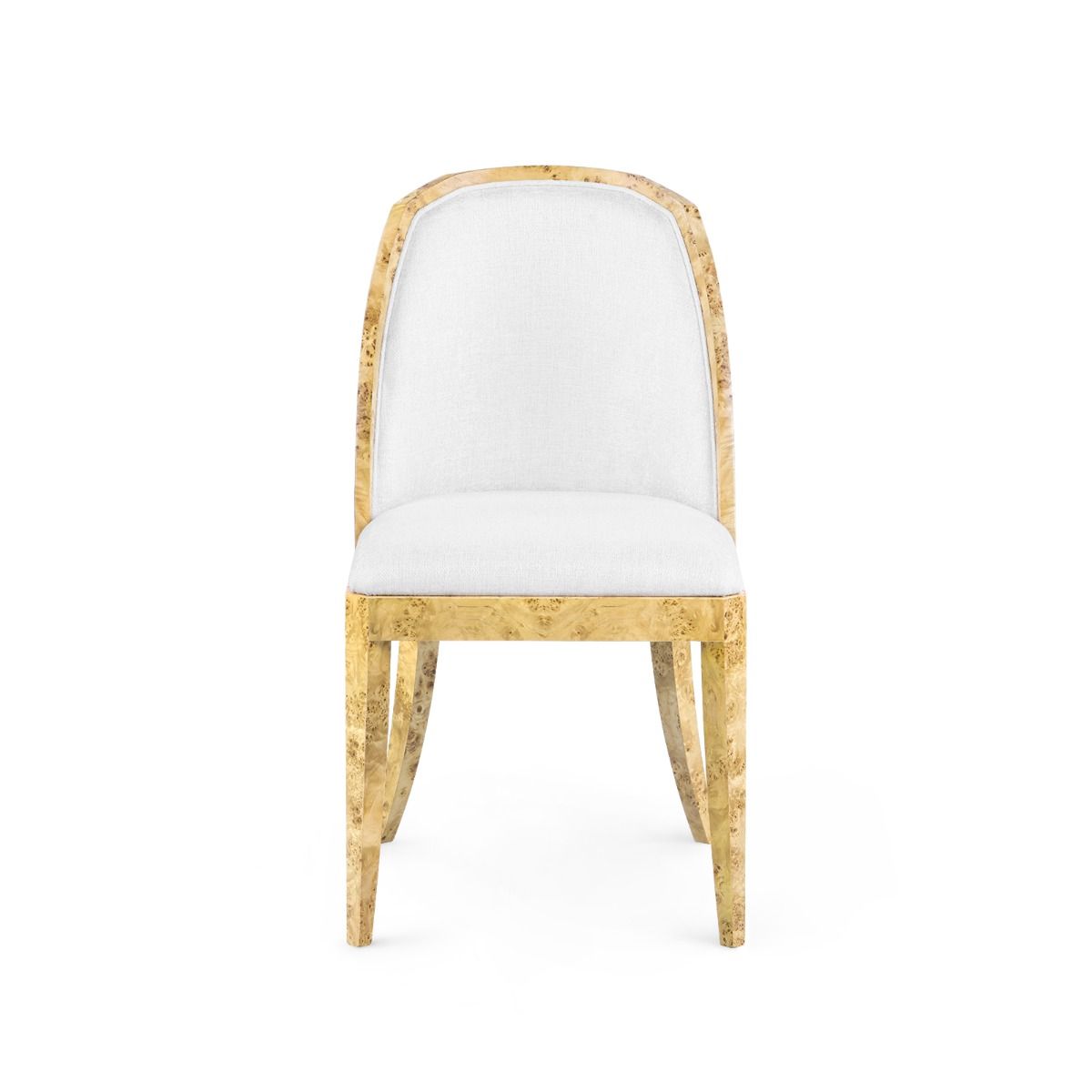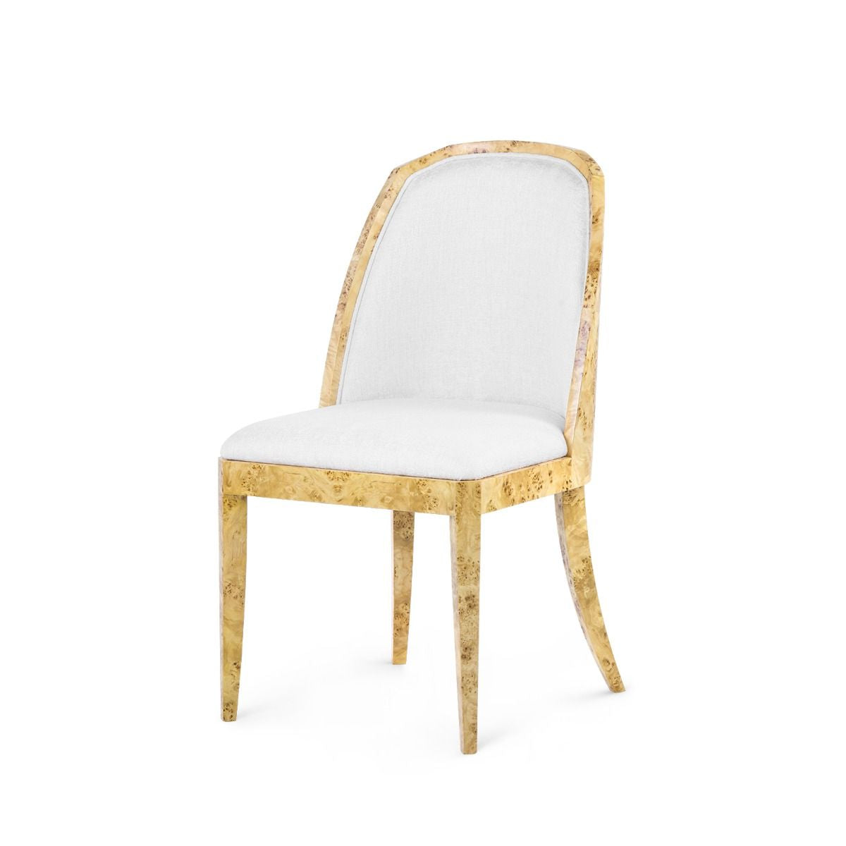 Crafted from luxurious burl, the Ophelia Side Chair in Arabica Burl by Villa and House features a fully veneered backrest with a graceful curve and subtle angularity for added character. The chair is upholstered in a flatwoven fabric, evoking a refined softness.