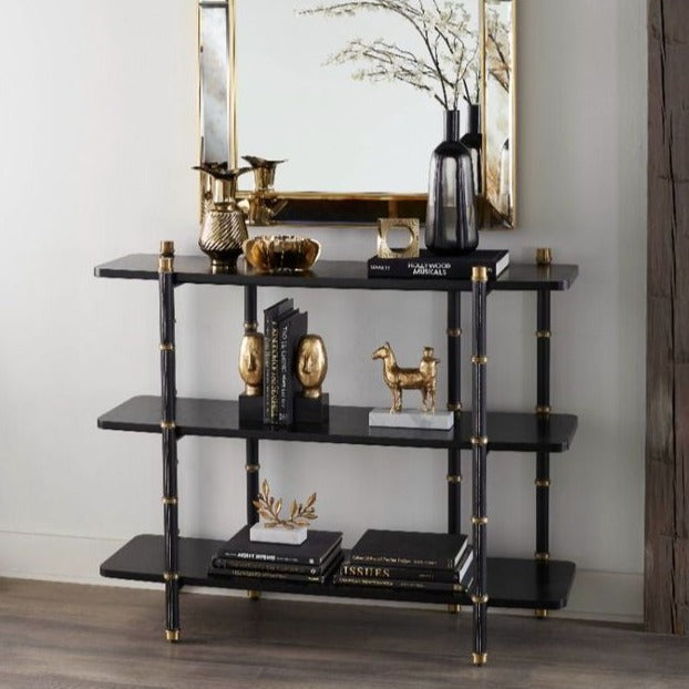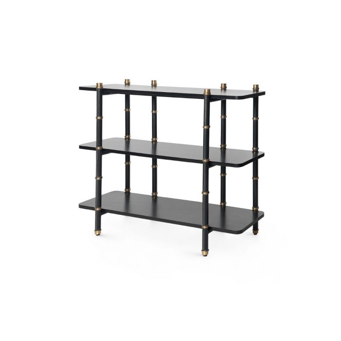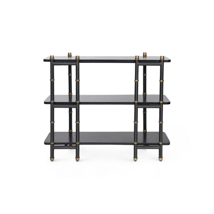 The Reneau Low Shelf from Villa & House is a sleek and stylish piece that exudes a captivating aesthetic. It boasts 3 tiers of lacquered shelves and leather-wrapped corner posts with antique brass accents, making it a modern and elegant addition to any space.