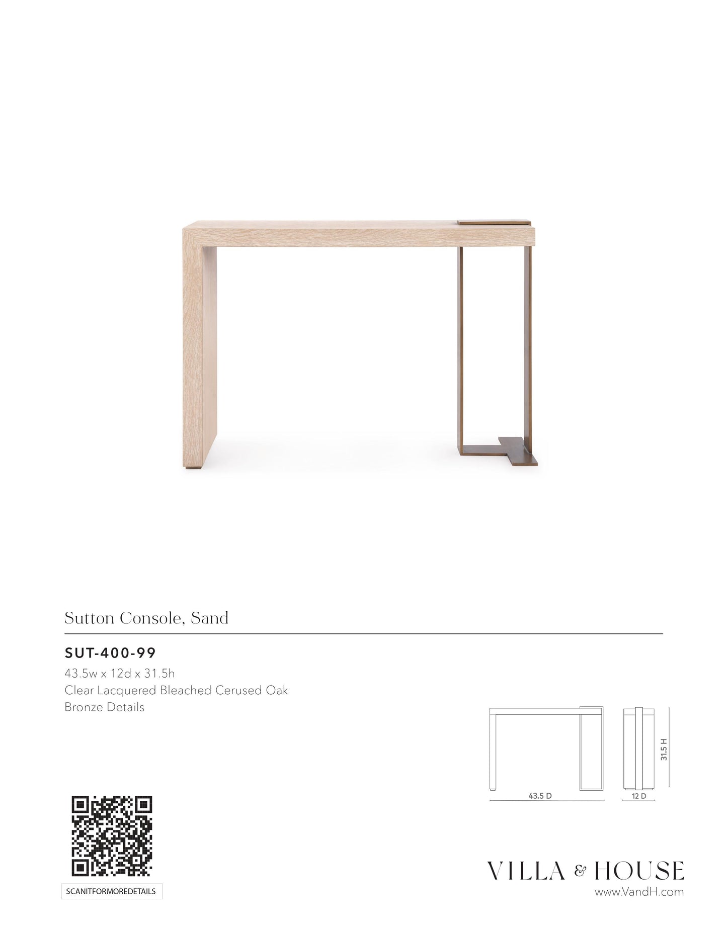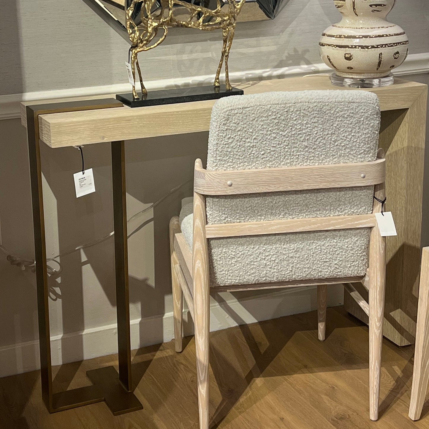 The Sutton Console in Sand from Villa & House is a unique architectural piece finished in Clear Lacquered Bleached Cerused Oak. The asymmetrical element of the design is a single rectangular leg of lightly finished bronze, a detail that highlights the minimal, modern aesthetic.