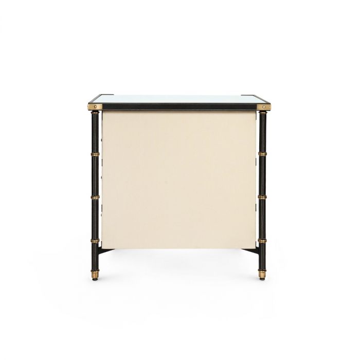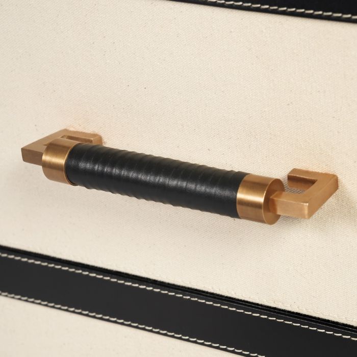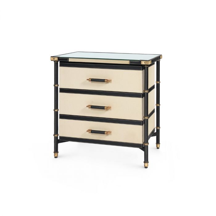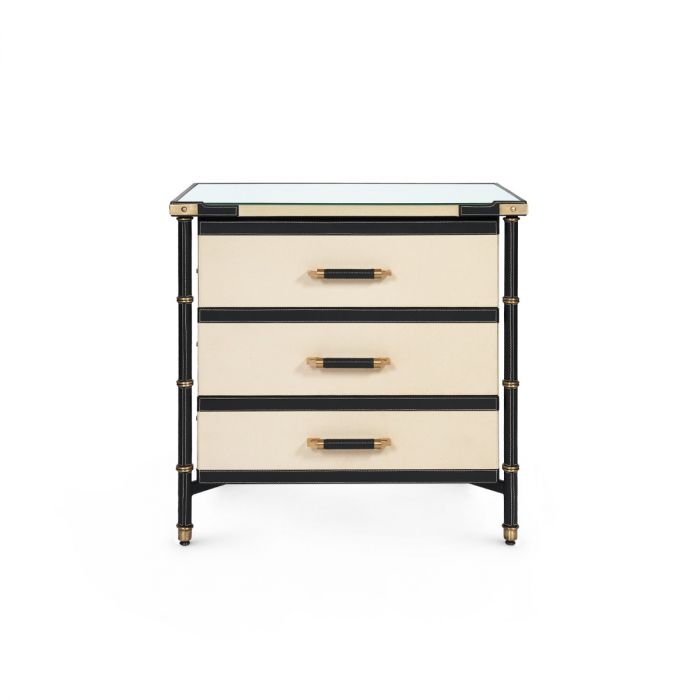 The Toulon 3-Drawer Side Table in Black Leather by Villa & House showcases a leather-wrapped frame and canvas drawers. Its tempered-glass top adds a modern touch, while the leather accents feature contrast stitching and antique brass rings, evoking a sophisticated French campaign style.