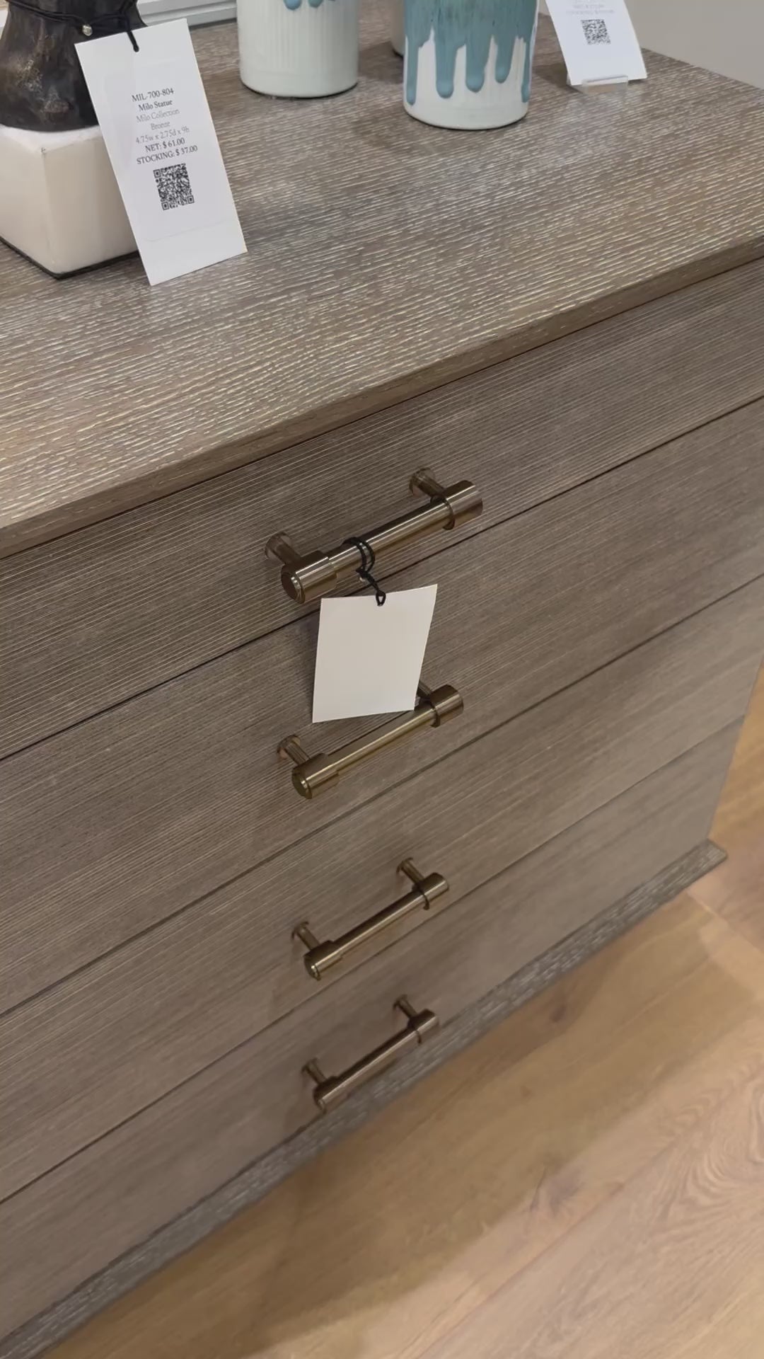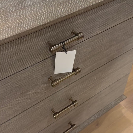 The Watson Large 4 Drawer Light Mocha Shimmer Weave by Villa & House boasts a custom shimmer grasscloth in an elegant grey-brown tone, giving it a sleek, modern look with a boldmasculine touch. It also includes unique cast bronze bar pulls that add to its striking design, while its four spacious drawers on soft-closing glides provide ample storage.