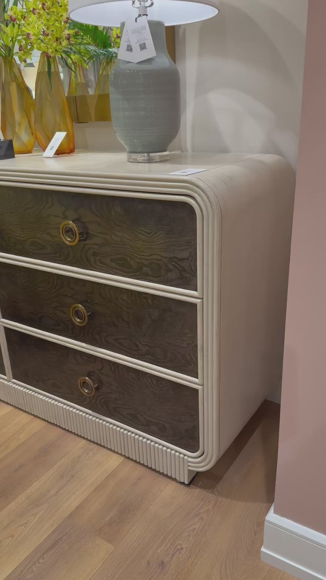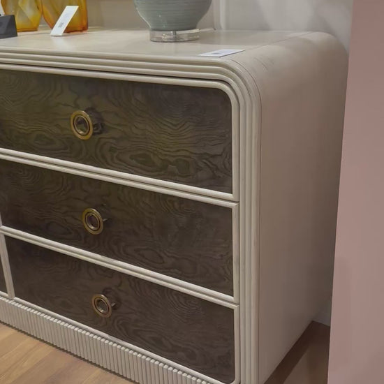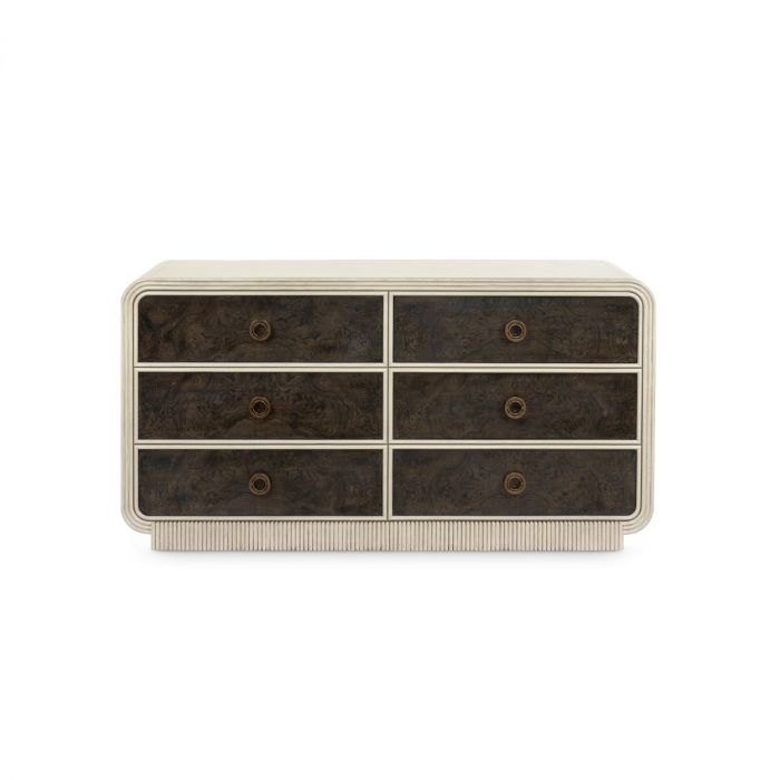 The Wyatt 6-Drawer by Villa & House sports graceful curved corners and fluted edges, finished in a luminous Sailcloth Sheen that highlights its sleek contours. Featuring rich burlwood-paneled drawer-fronts embellished with an organic pattern, this piece adds visual appeal and elevates the overall design. Complete with antique brass ring pulls, this piece is truly one-of-a-kind.