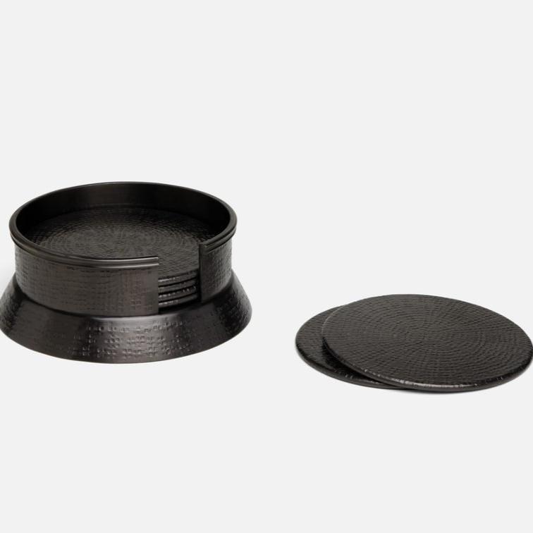 Elevate your bar's aesthetic with the sleek, etched surface of this stylish set. The Winsford Black Nickel Coaster Set, crafted by Pigeon and Poodle, features a unique crisscross pattern that adds both texture and shine, making it a must-have for your bottle service collection.