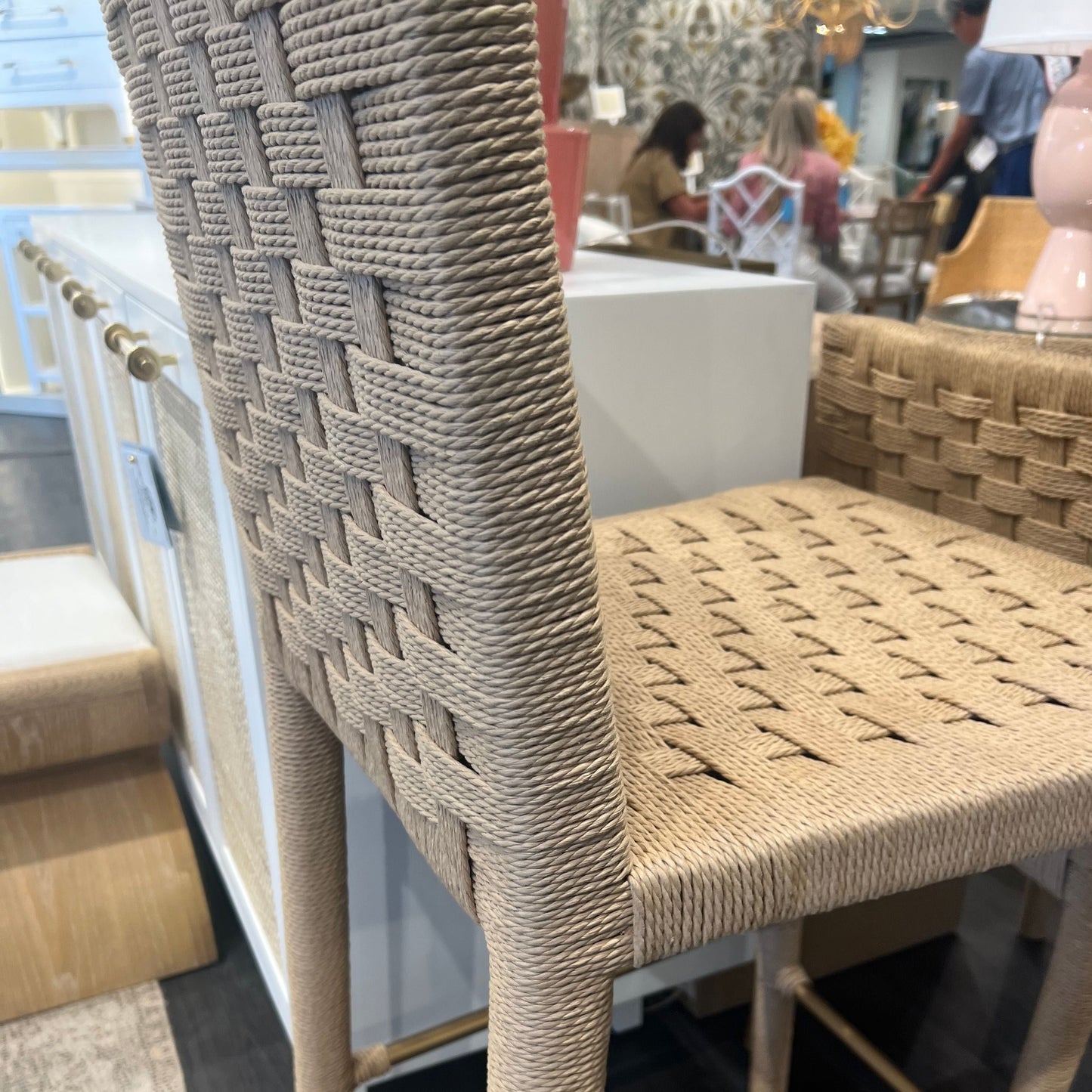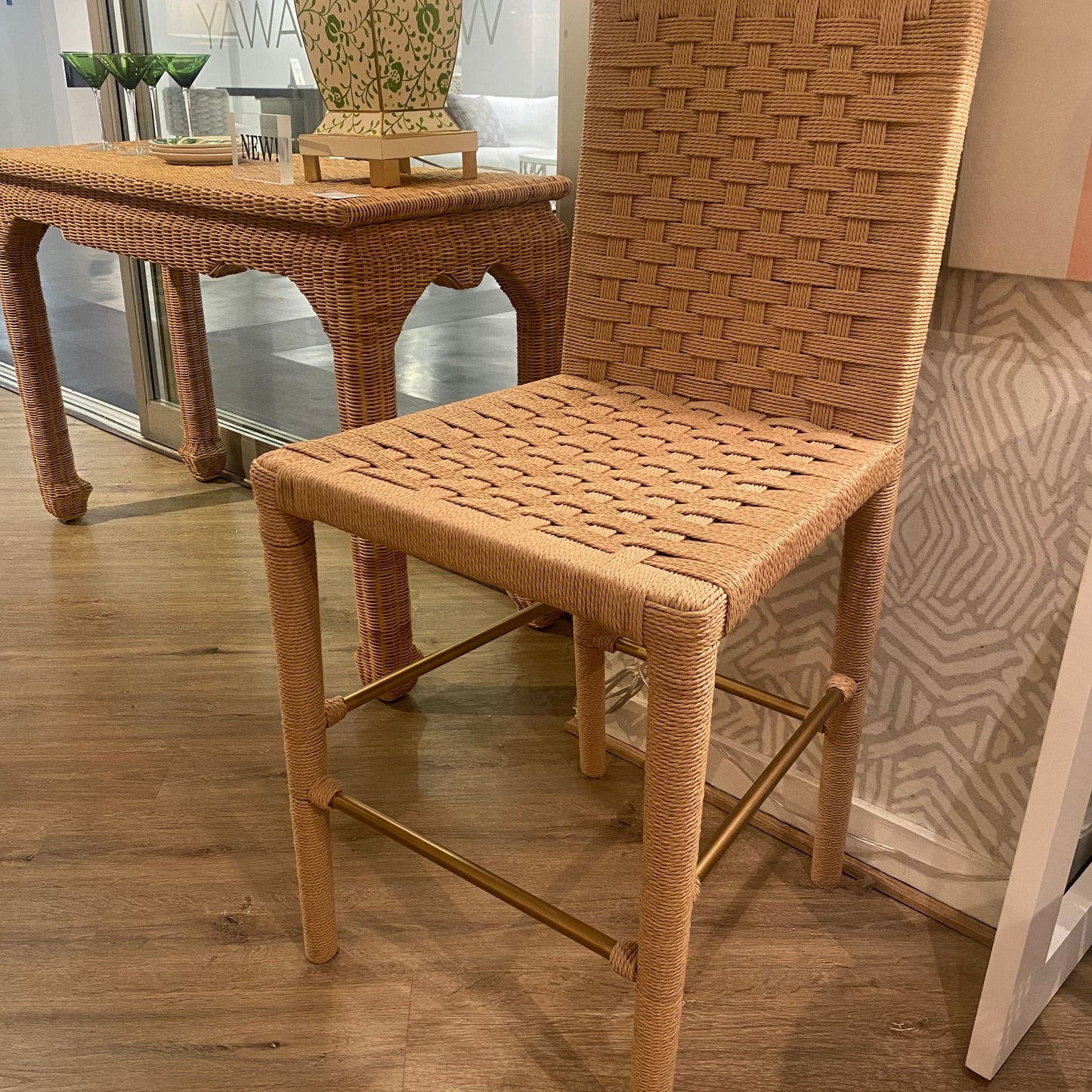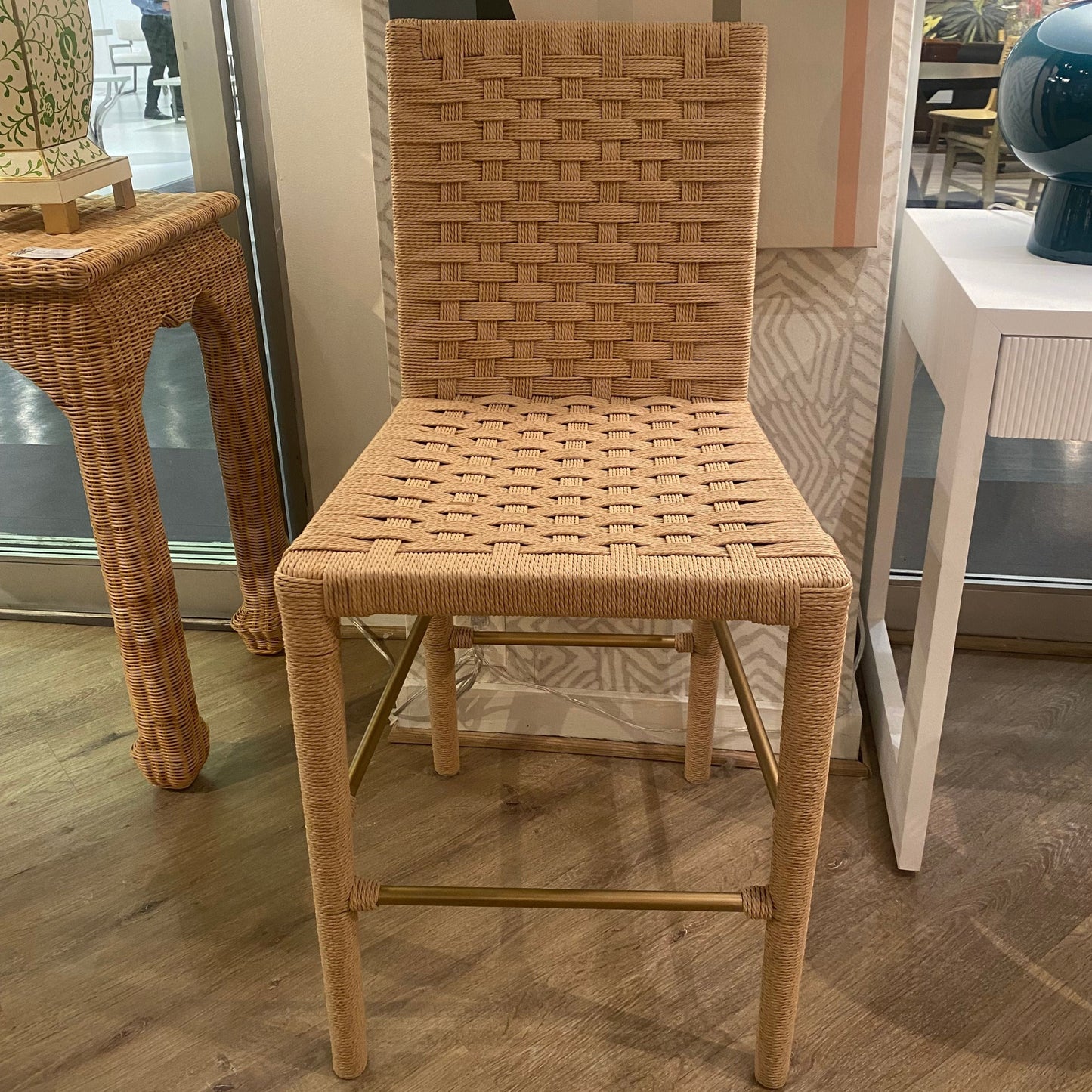 Visually striking and functional, the Burbank Counter Stool in Natural Rope from Worlds Away features natural rope basketweave pattern bar stool with antique brass stretcher. The Burbank Counter Stool is perfect for dining rooms, kitchens and home bars. *Indoor use only.
