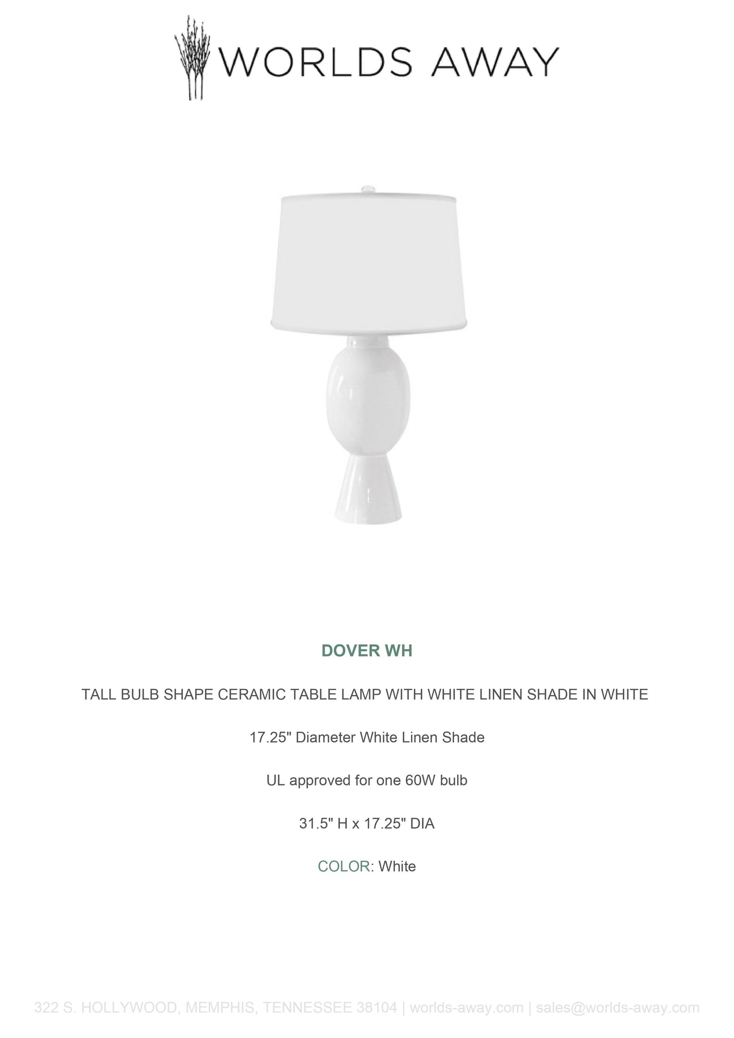 Illuminate your space with the Dover Lamp in White and White Linen from Worlds Away. The Dover Lamp features a tall bulb shape ceramic table lamp with white linen shade in White.