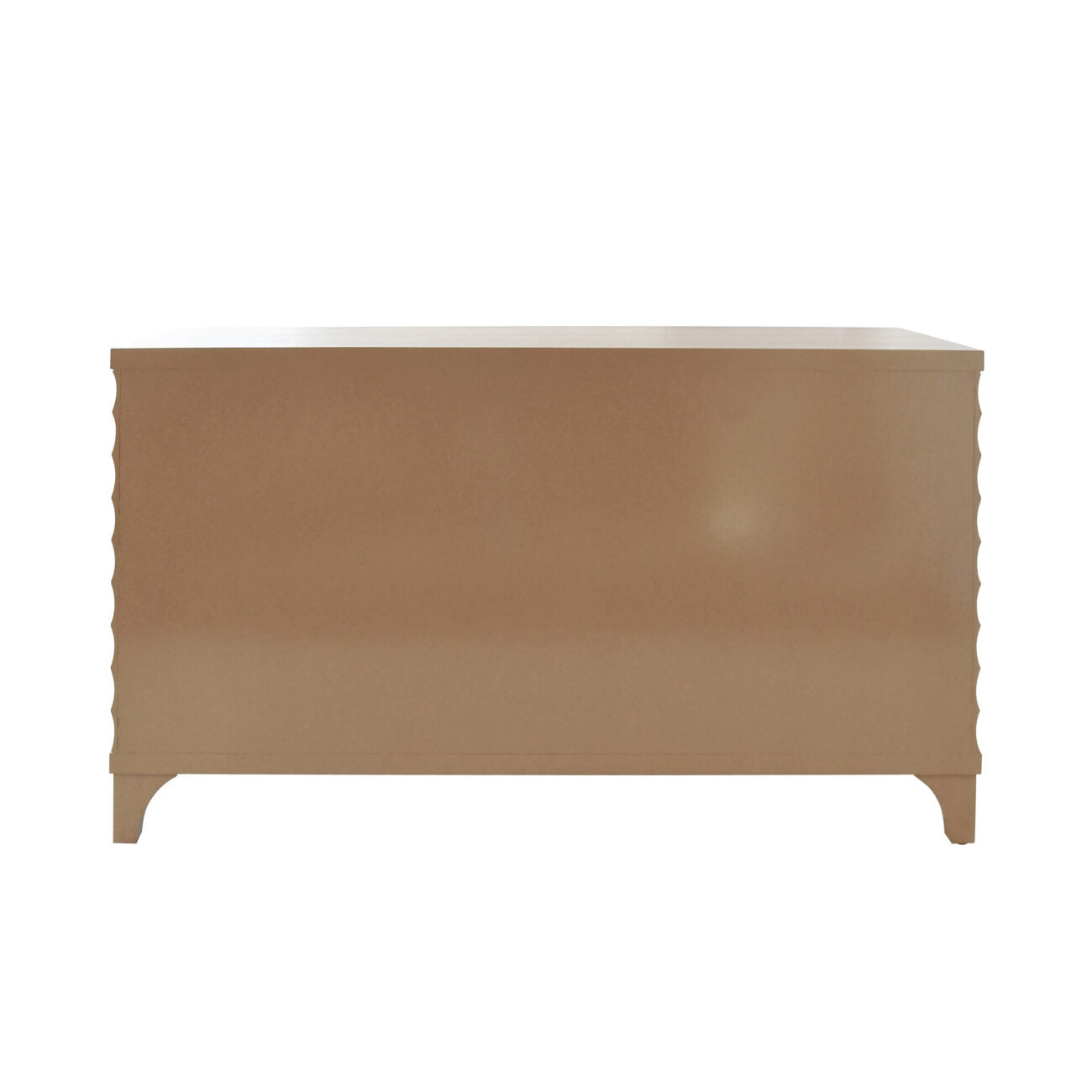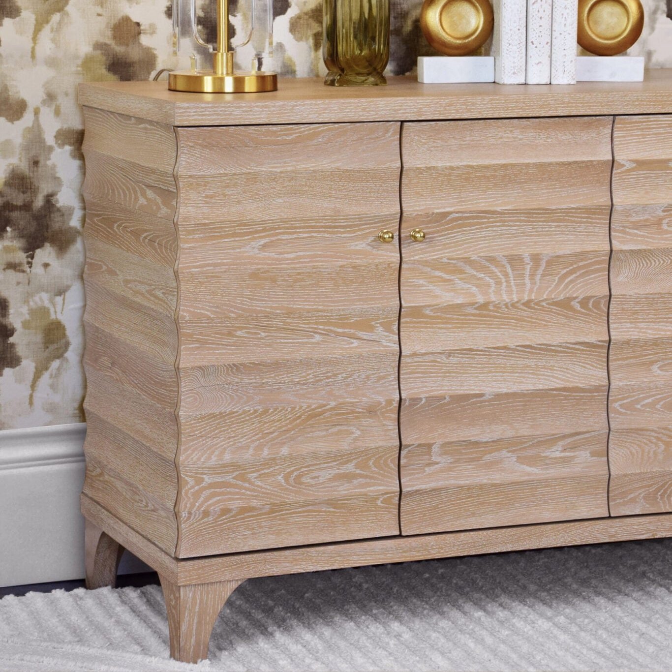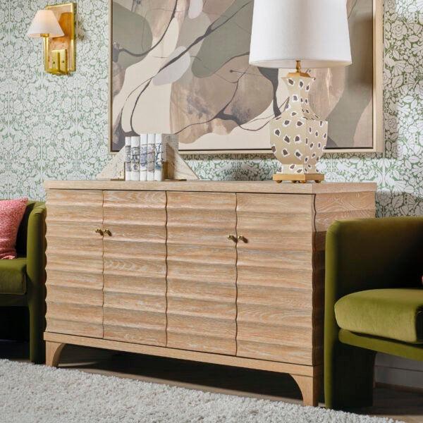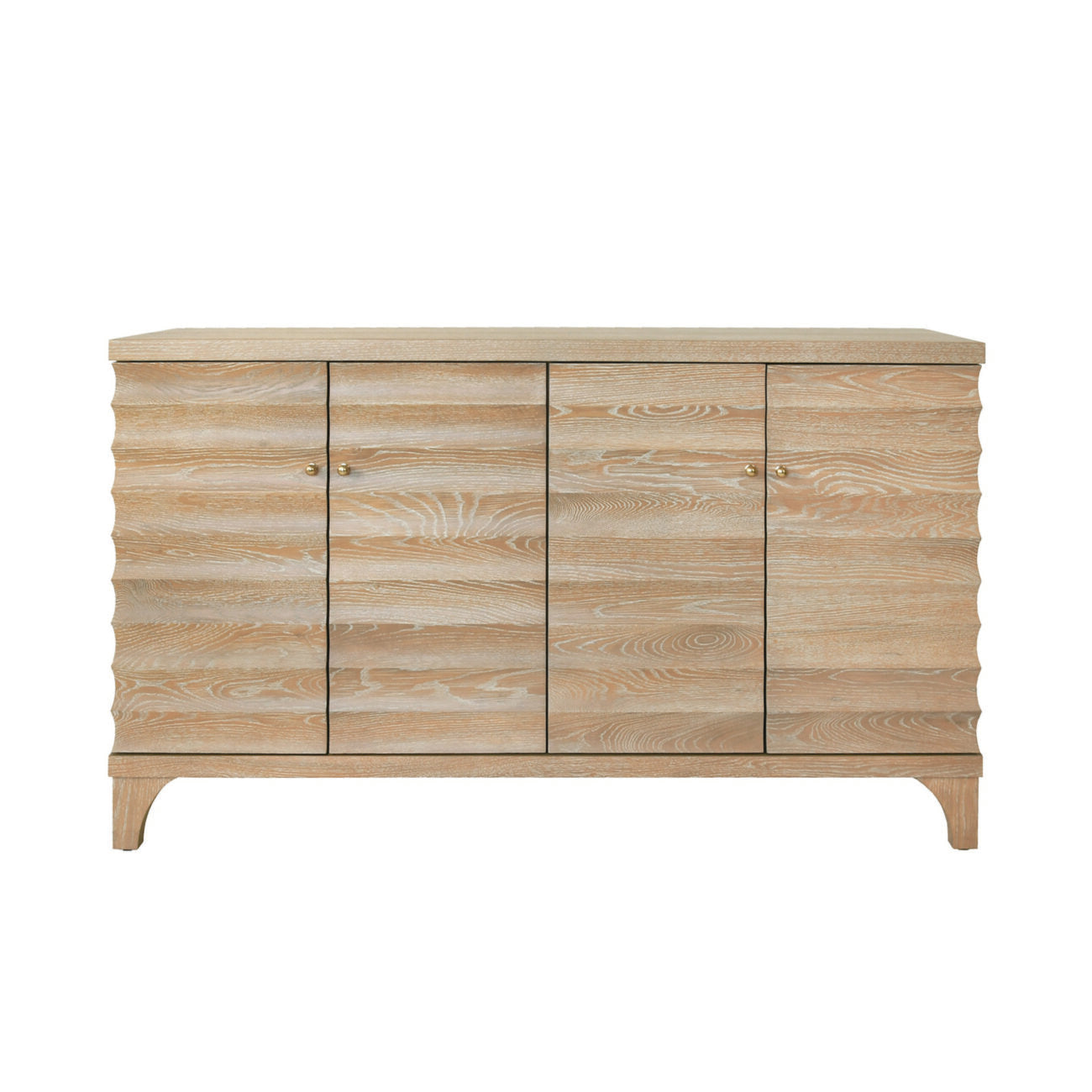 The Gates Four Door Buffet in Cerused Oak from Worlds Away includes a horizontal fluted design and two adjustable, removable shelves, all in cerused oak, for a versatile and stylish storage solution.