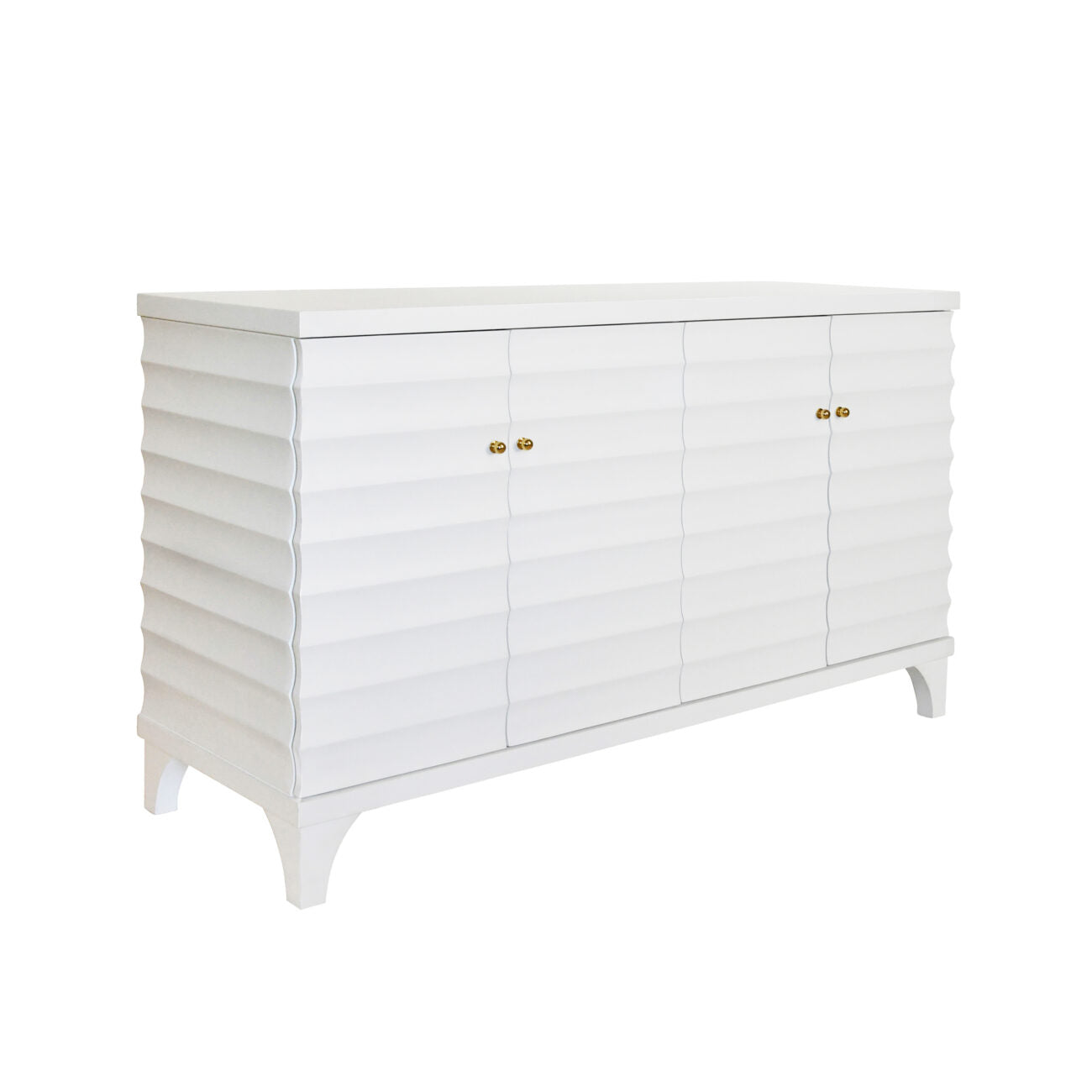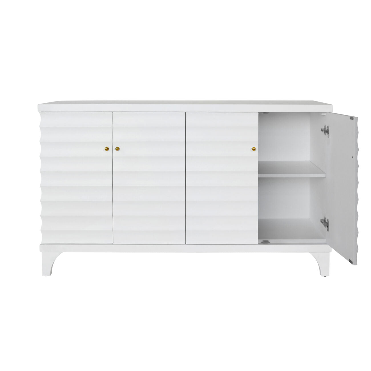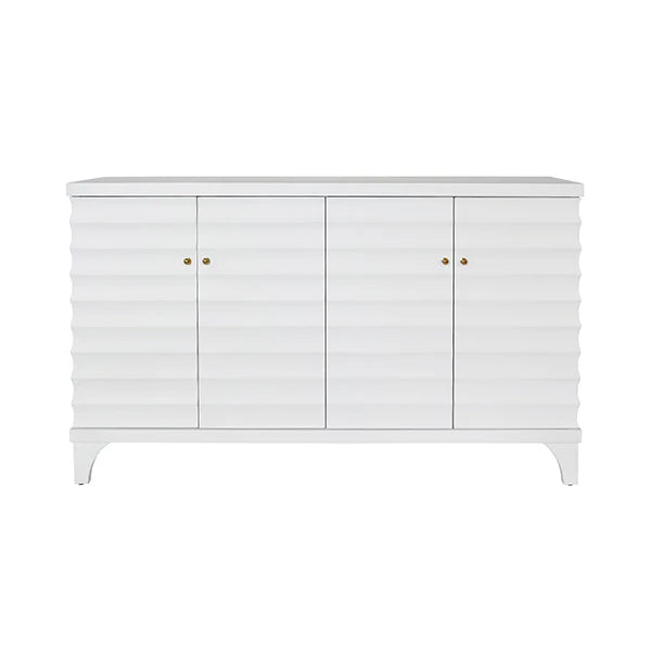 The Gates Four Door Buffet in Matte White Lacquer from Worlds Away includes a horizontal fluted design and two adjustable, removable shelves, all in matte white lacquer, for a versatile and stylish storage solution.