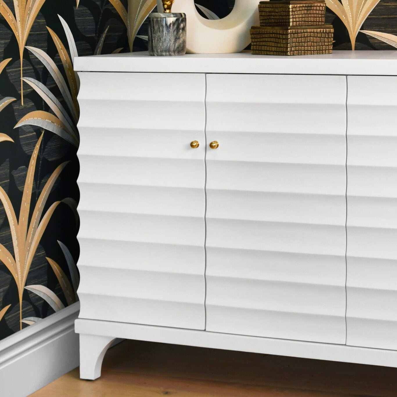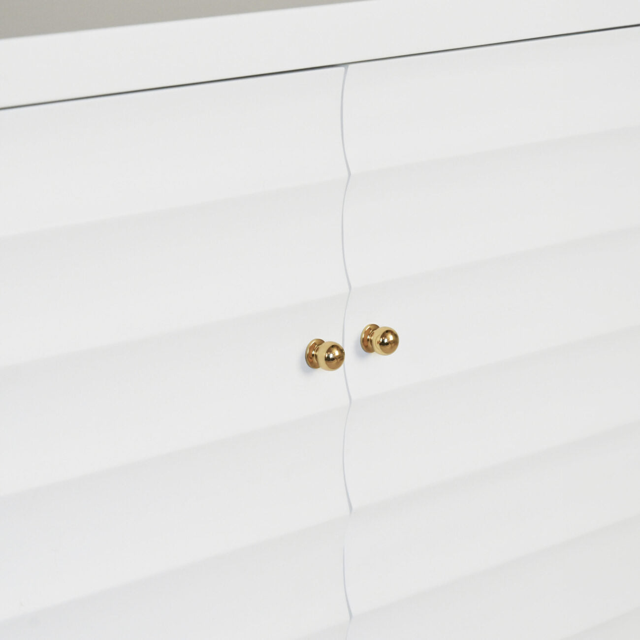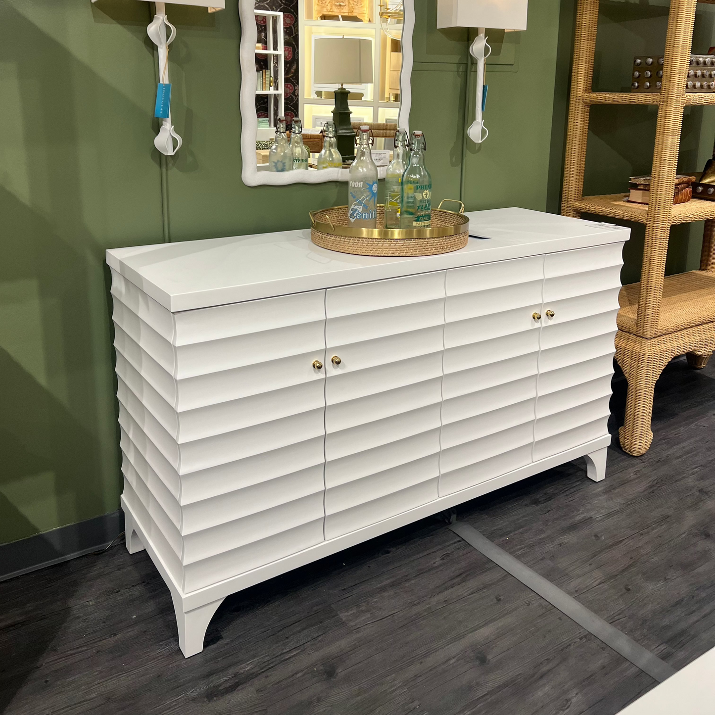 The Gates Four Door Buffet in Matte White Lacquer from Worlds Away includes a horizontal fluted design and two adjustable, removable shelves, all in matte white lacquer, for a versatile and stylish storage solution.