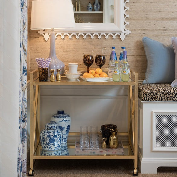 The Worlds Away Gerard Bar Cart showcases a gold leaf finished frame with X detailing on either side. Bar carts with a mirrored top and lower shelf, as seen on the Gerard by Worlds Away, accent this unique bar cart with glitz and glamour! A rolling bar cart like the modern, contemporary Gerard Bar Cart from Worlds Away delivers a conversation piece as you entertain guests.