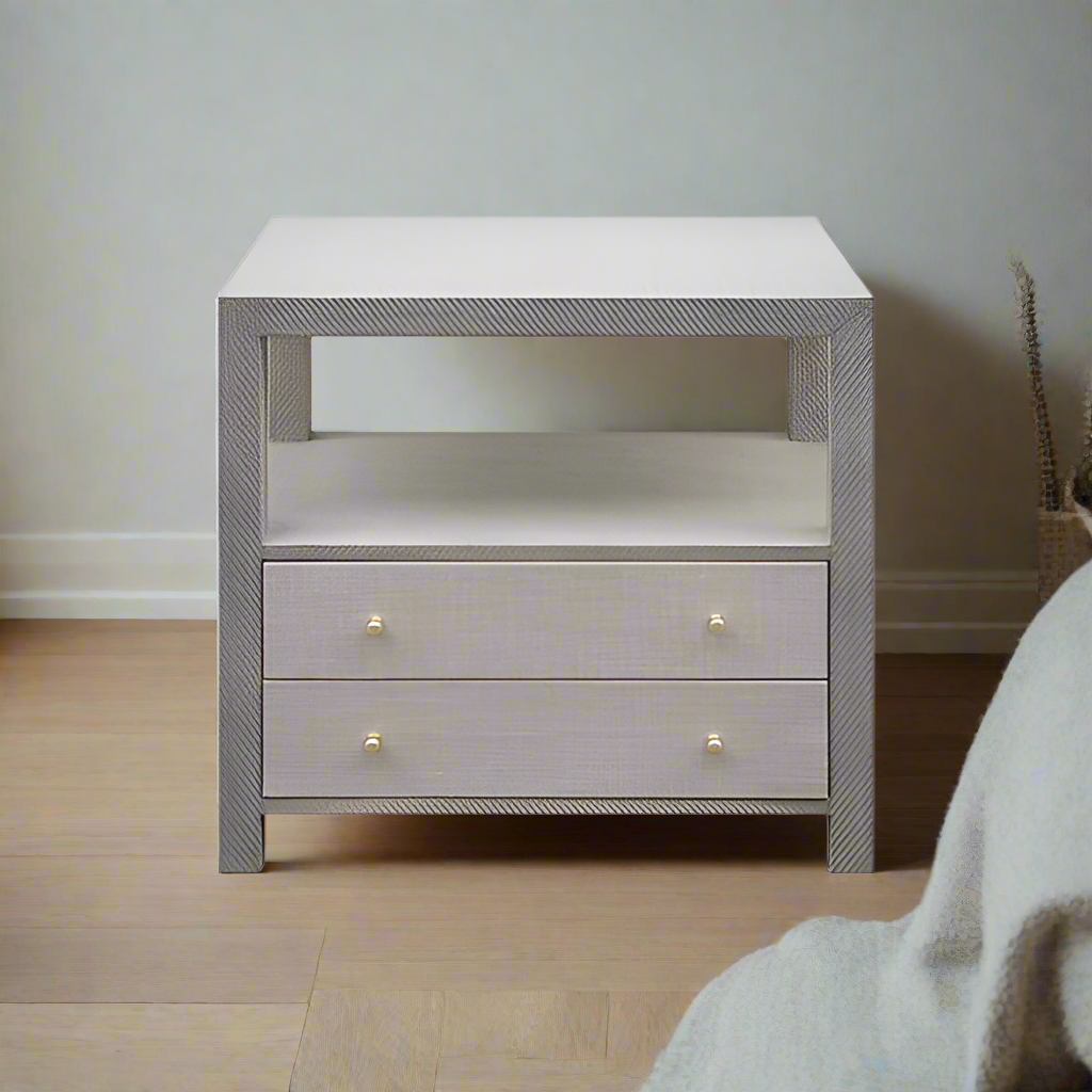 The Hattie Side Table in Grey Grasscloth from Worlds Away features a grasscloth covering for a textured finish. The Hattie table is great for storage with its two grey linen drawers and brass hardware. Place a pair of these nightstands from Worlds Away in the bedroom to organize and display fabulous lighting.