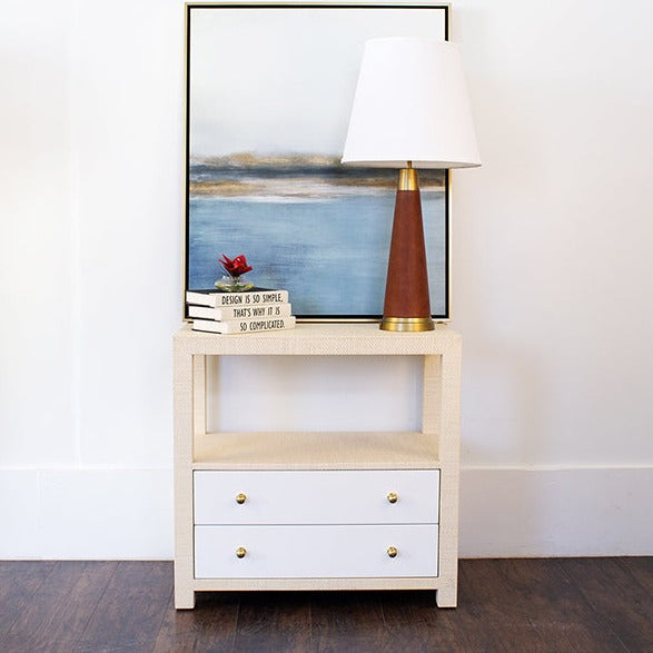 The Hattie Side Table in Natural Grasscloth from Worlds Away features a grasscloth covering for a textured finish. The Hattie table is great for storage with its two white lacquer drawers and brass hardware. Place a pair of these nightstands from Worlds Away in the bedroom to organize and display fabulous lighting.
