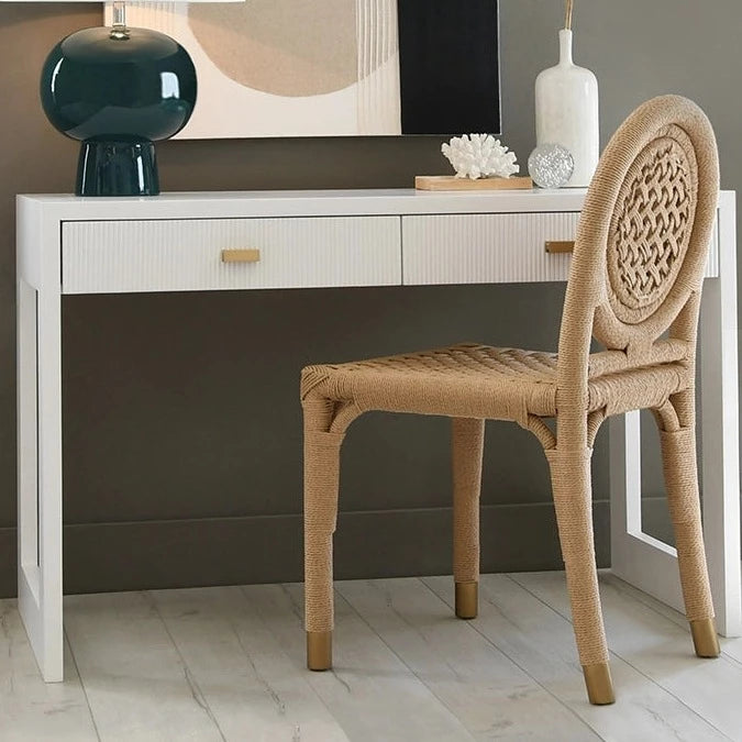 The stunning Larkin Desk in Matte White Lacquer from Worlds Away features two drawers that is not only expertly designed but handcrafted to perfection. The fluted detail adds depth and character to the overall aesthetic giving the piece a unique and stylish edge.