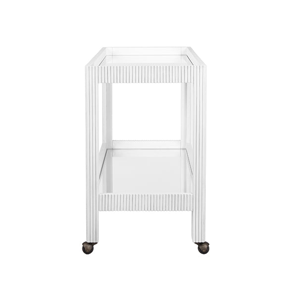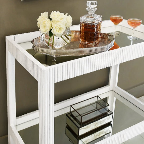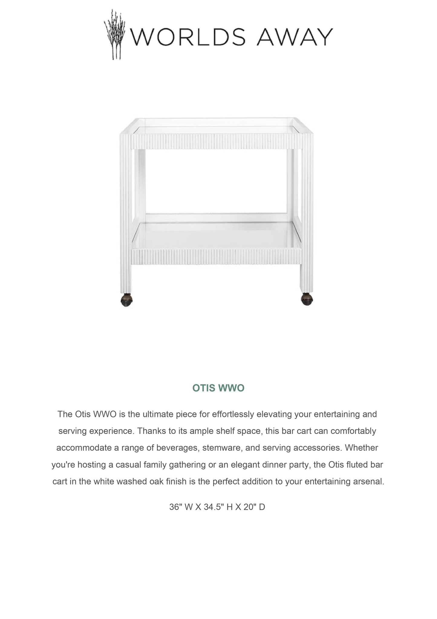 The Otis Bar Cart in White Washed Oak from Worlds Away is the ultimate piece for effortlessly elevating your entertaining and serving experience. Thanks to its ample shelf space, this bar cart can comfortably accommodate a range of beverages, stemware, and serving accessories. Whether you're hosting a casual family gathering or an elegant dinner party, the Otis fluted bar cart in the white-washed oak finish is the perfect addition to your entertaining arsenal.