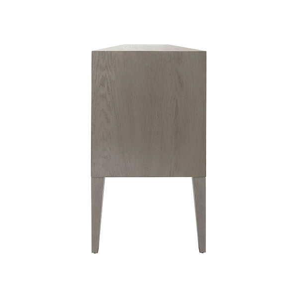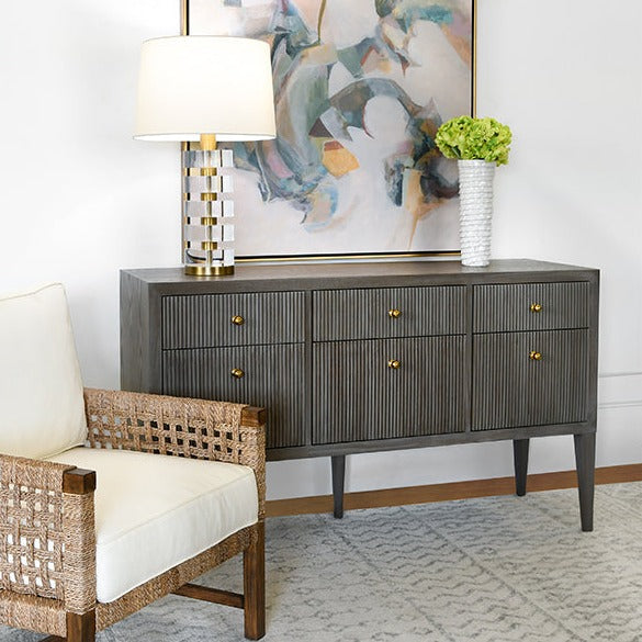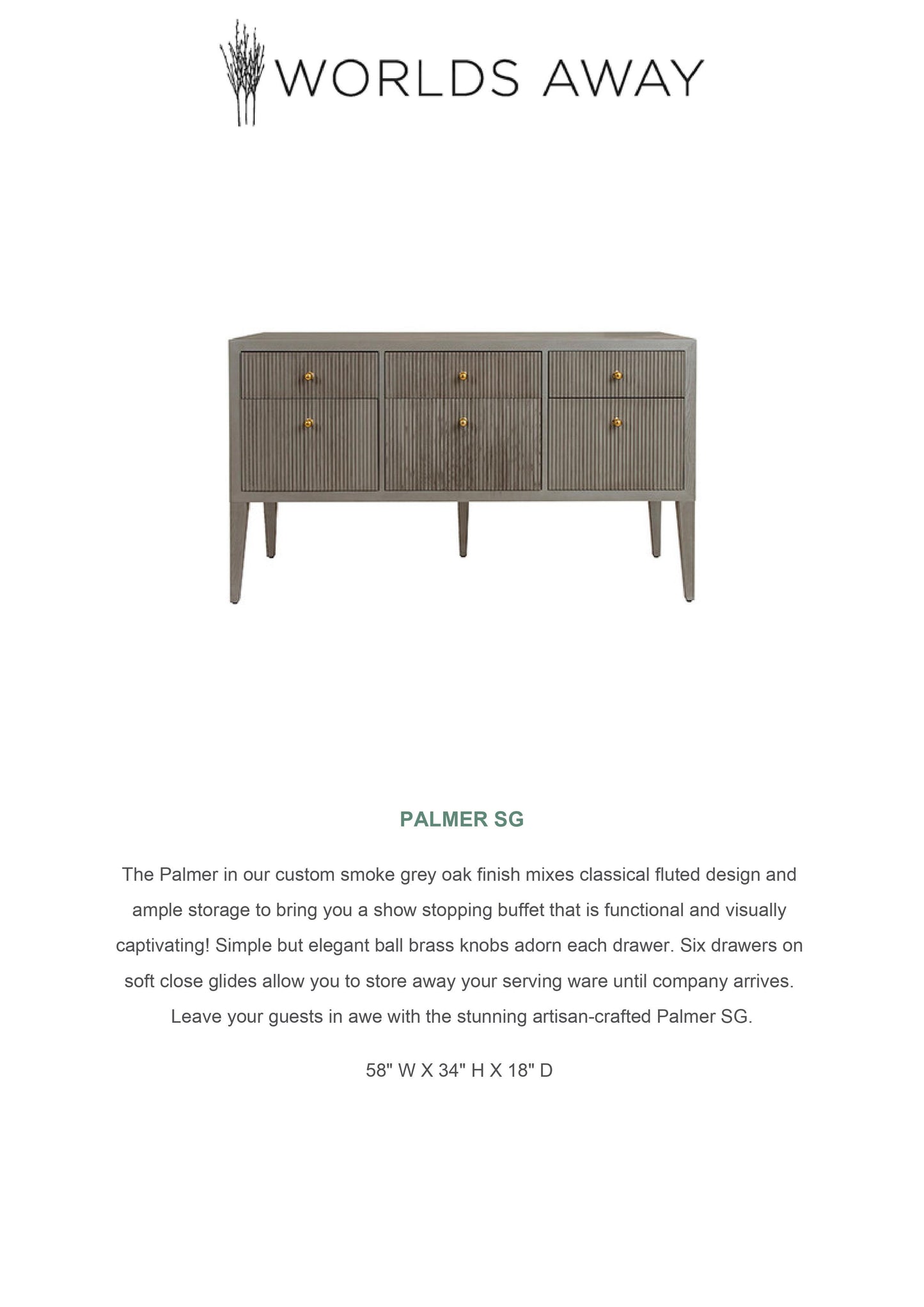 The Palmer Buffet in Smoke Grey Oak from Worlds Away mixes classical fluted design and ample storage to bring you a show stopping buffet that is functional and visually captivating! Simple but elegant ball brass knobs adorn each drawer. Six drawers on soft close glides allow you to store away your serving ware.