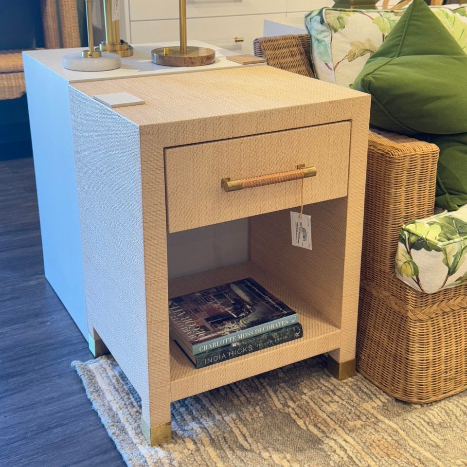 Traditional tones, the Pelham Side Table in Natural Grasscloth from Worlds Away features one drawer with rattan wrapped handles in natural grasscloth. Ideally used as a nightstand, side tables like the versatile Pelham would be a great piece to have between two chairs in any sitting area of the home.