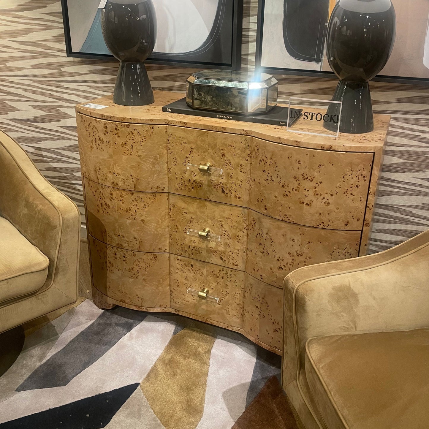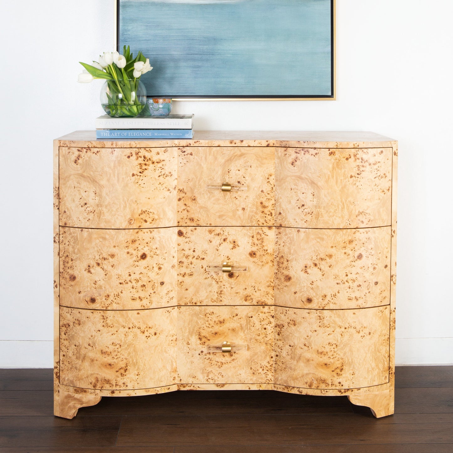 The Worlds Away Plymouth Chest in burl wood features a 3 drawer cabinet with irregular patterns and small spots that give it an elegant and organic feel. Enhanced with beautiful acrylic and brass hardware, the Plymouth by Worlds Away creates an elegant ambiance in homes and offices alike.